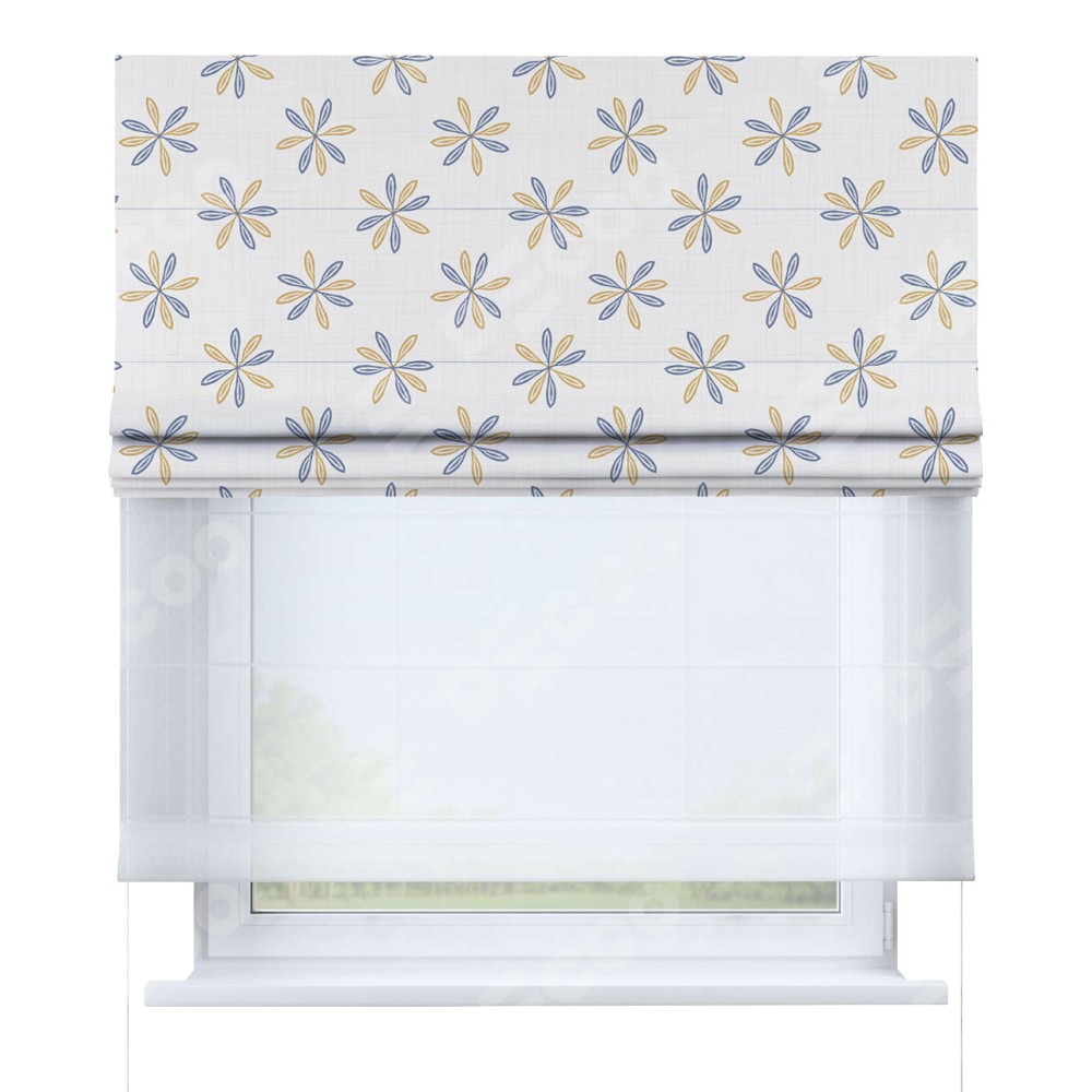 Римская штора день-ночь производителя «Cortin», используется для проёма, пошита из двух полотен, с лицевой блэкаут с нанесением сублимационной печати «Ромашки кантри», вторая ткань тюль (по стандарту комплектуется тюль белого цвета артикул V-01). Имеет универсальный механизм и подходит для монтажа: на потолок, на стену и в нишу.