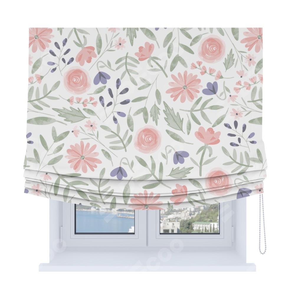 Римская штора Soft производителя «Cortin», используется для проёма, пошита из ткани блэкаут с нанесением сублимационной печати «Изысканные цветы». Имеет универсальный механизм и подходит для монтажа: на потолок, на стену и в нишу. В отличие от стандартных римских штор, римская штора Soft не имеет горизонтальных вставок и нижнего отвеса. Это позволяет ткани произвольно драпироваться в свободные мягкие складки.