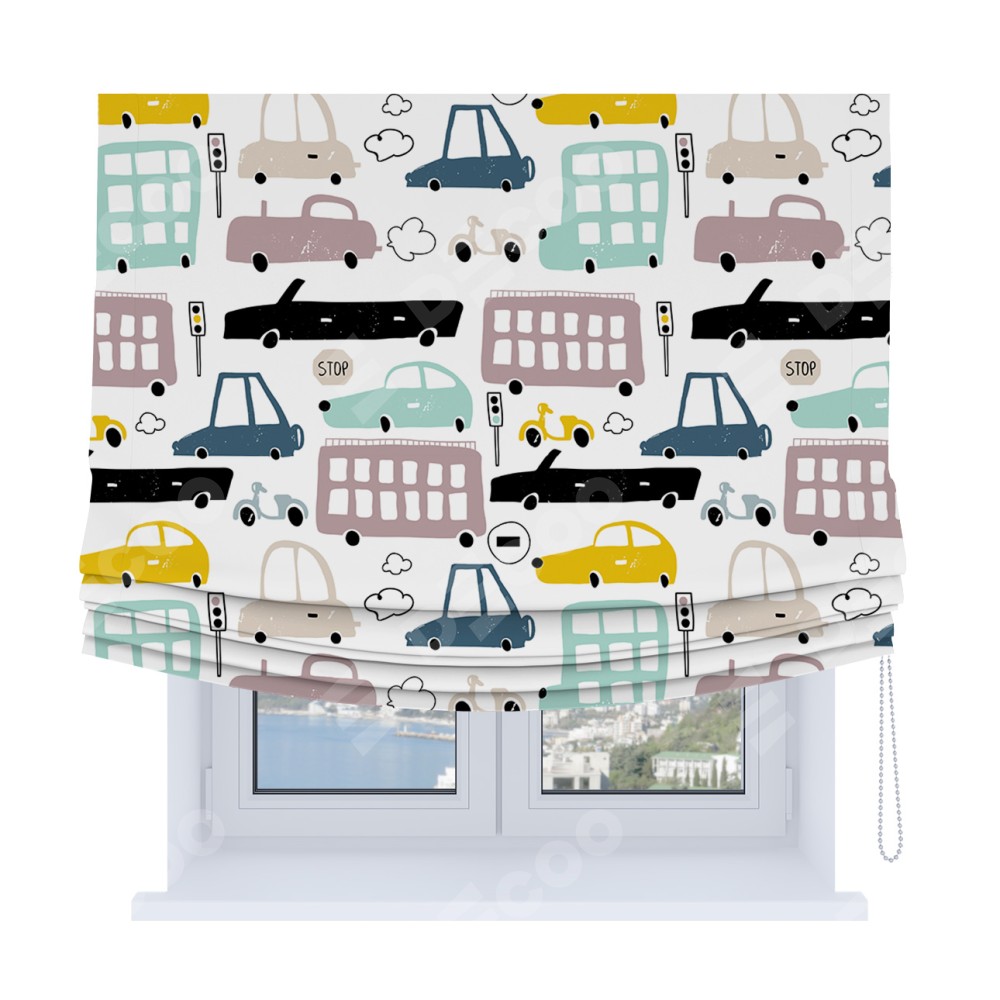 Римская штора Soft производителя «Cortin», используется для проёма, пошита из ткани блэкаут с нанесением сублимационной печати «Красочный трафик». Имеет универсальный механизм и подходит для монтажа: на потолок, на стену и в нишу. В отличие от стандартных римских штор, римская штора Soft не имеет горизонтальных вставок и нижнего отвеса. Это позволяет ткани произвольно драпироваться в свободные мягкие складки.