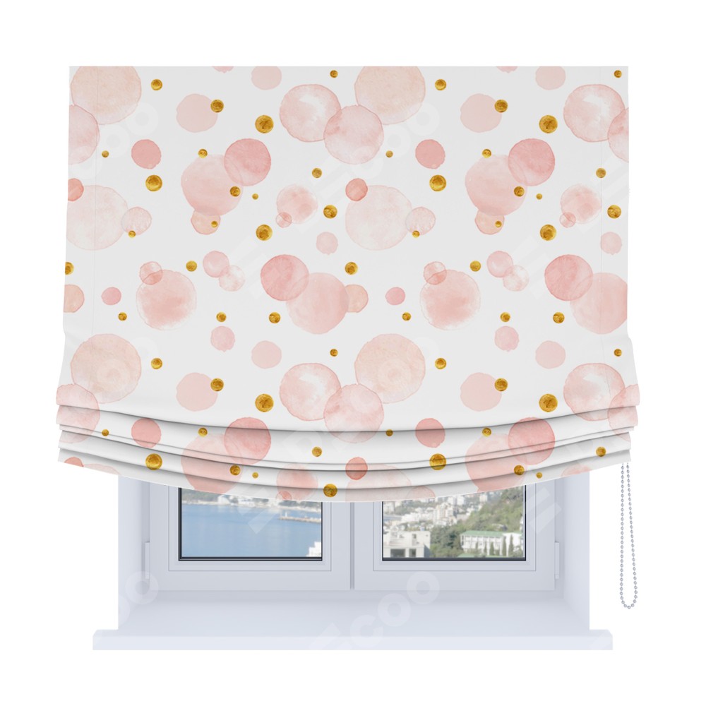Римская штора Soft производителя «Cortin», используется для проёма, пошита из ткани блэкаут с нанесением сублимационной печати «Круги и точки». Имеет универсальный механизм и подходит для монтажа: на потолок, на стену и в нишу. В отличие от стандартных римских штор, римская штора Soft не имеет горизонтальных вставок и нижнего отвеса. Это позволяет ткани произвольно драпироваться в свободные мягкие складки.