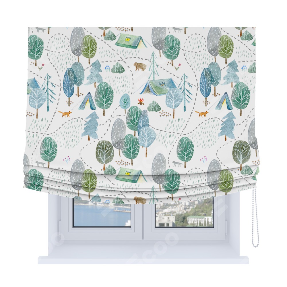 Римская штора Soft производителя «Cortin», используется для проёма, пошита из ткани блэкаут с нанесением сублимационной печати «Лесистая местность». Имеет универсальный механизм и подходит для монтажа: на потолок, на стену и в нишу. В отличие от стандартных римских штор, римская штора Soft не имеет горизонтальных вставок и нижнего отвеса. Это позволяет ткани произвольно драпироваться в свободные мягкие складки.
