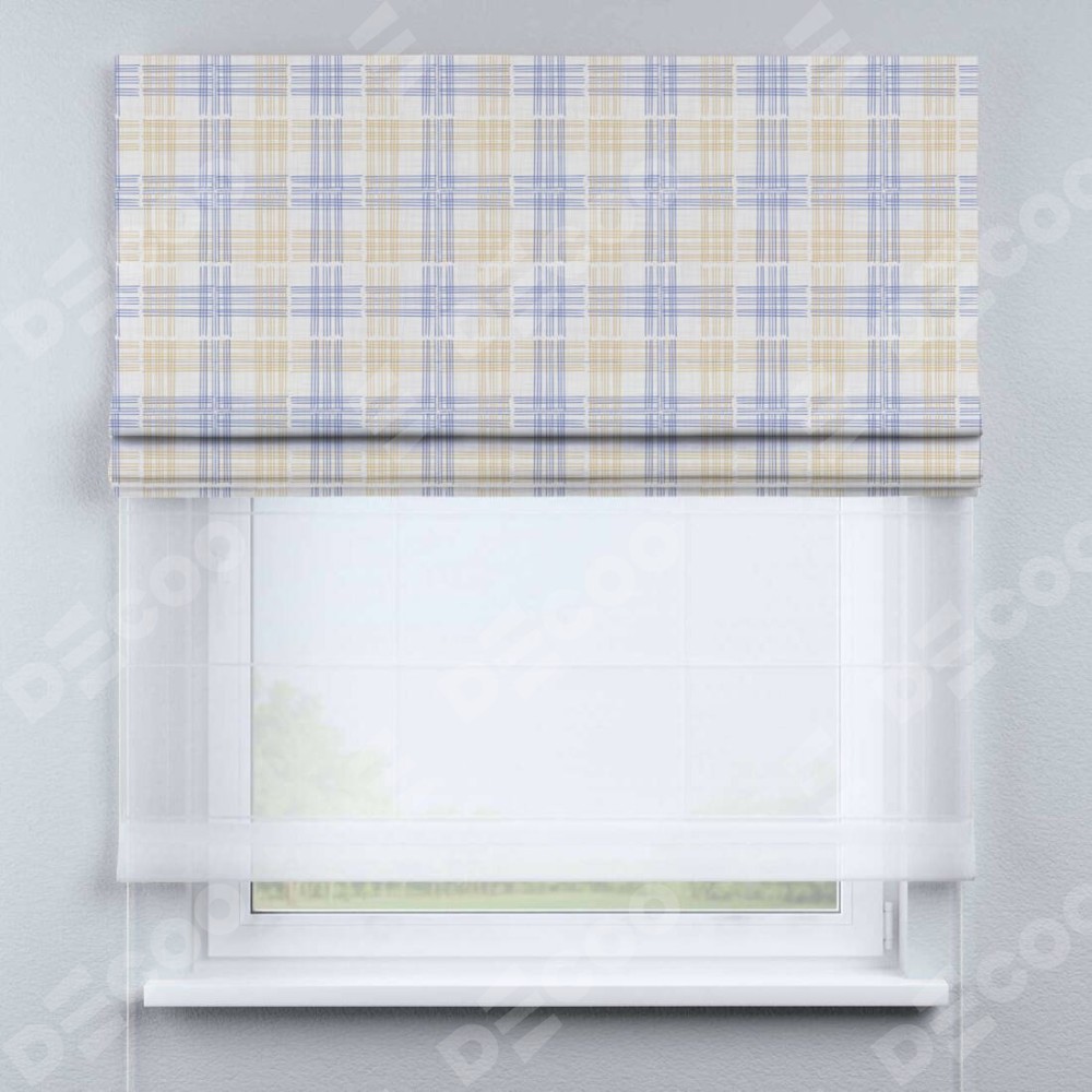 Римская штора день-ночь производителя «Cortin», используется для проёма, пошита из двух полотен, с лицевой блэкаут с нанесением сублимационной печати «Клетки кантри», вторая ткань тюль (по стандарту комплектуется тюль белого цвета артикул V-01). Имеет универсальный механизм и подходит для монтажа: на потолок, на стену и в нишу.