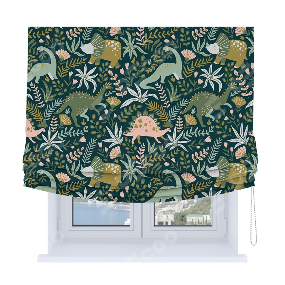 Римская штора Soft производителя «Cortin», используется для проёма, пошита из ткани блэкаут с нанесением сублимационной печати «Удивительный дино». Имеет универсальный механизм и подходит для монтажа: на потолок, на стену и в нишу. В отличие от стандартных римских штор, римская штора Soft не имеет горизонтальных вставок и нижнего отвеса. Это позволяет ткани произвольно драпироваться в свободные мягкие складки.