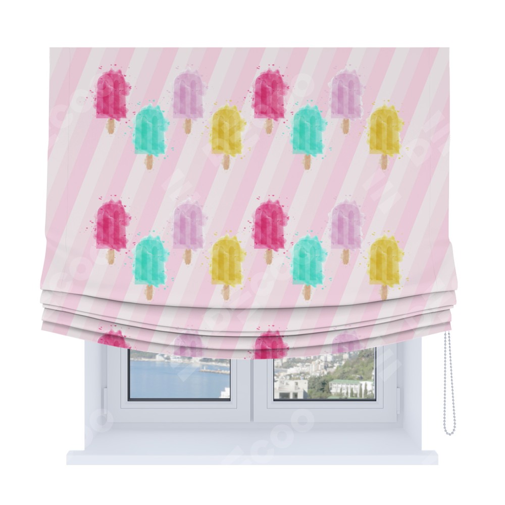 Римская штора Soft производителя «Cortin», используется для проёма, пошита из ткани блэкаут с нанесением сублимационной печати «Фруктовое мороженое». Имеет универсальный механизм и подходит для монтажа: на потолок, на стену и в нишу. В отличие от стандартных римских штор, римская штора Soft не имеет горизонтальных вставок и нижнего отвеса. Это позволяет ткани произвольно драпироваться в свободные мягкие складки.