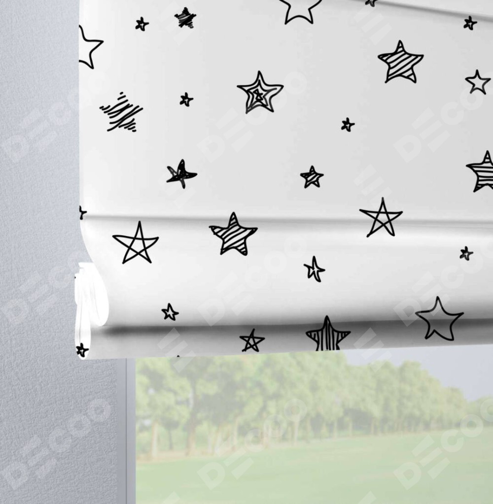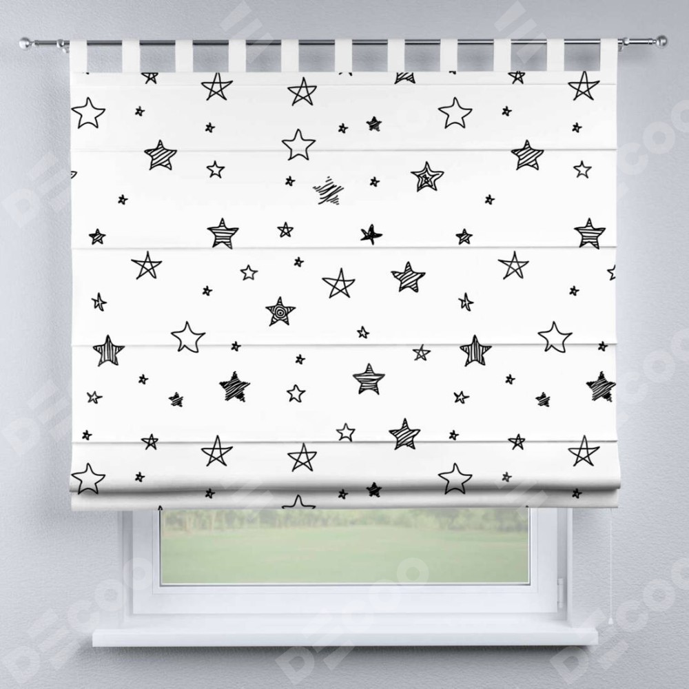 Римская штора производителя «Cortin», используется для проёма, пошита из ткани блэкаут с нанесением сублимационной печати «Звезды». Данная модель пошита на петлях, комплектуется на выбор круглым карнизом и подходит для монтажа на стену. Римская штора на петлях имеет простую систему регулировки высоты, отличительным преимуществом данной модели является простой способ монтажа. Достаточно повесить ее на трубу и штора готова!