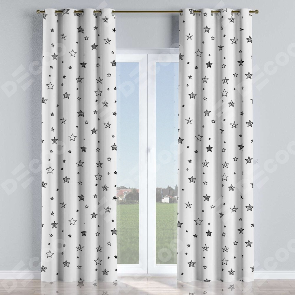 Комплект прямых штор, от производителя «Cortin», пошиты из ткани блэкаут с нанесением сублимационной печати «Звёзды». Данная модель пошита на люверсах, комплектуется на выбор круглым карнизом и подходит для монтажа на стену или потолок. Прямые шторы на люверсах шьются по стандарту с коэффициентом 1/2 (на 100 см. ширины проёма 200 см. ширины ткани), отличительным преимуществом данной модели является простой способ монтажа. Достаточно повесить ее на трубу и штора готова!
