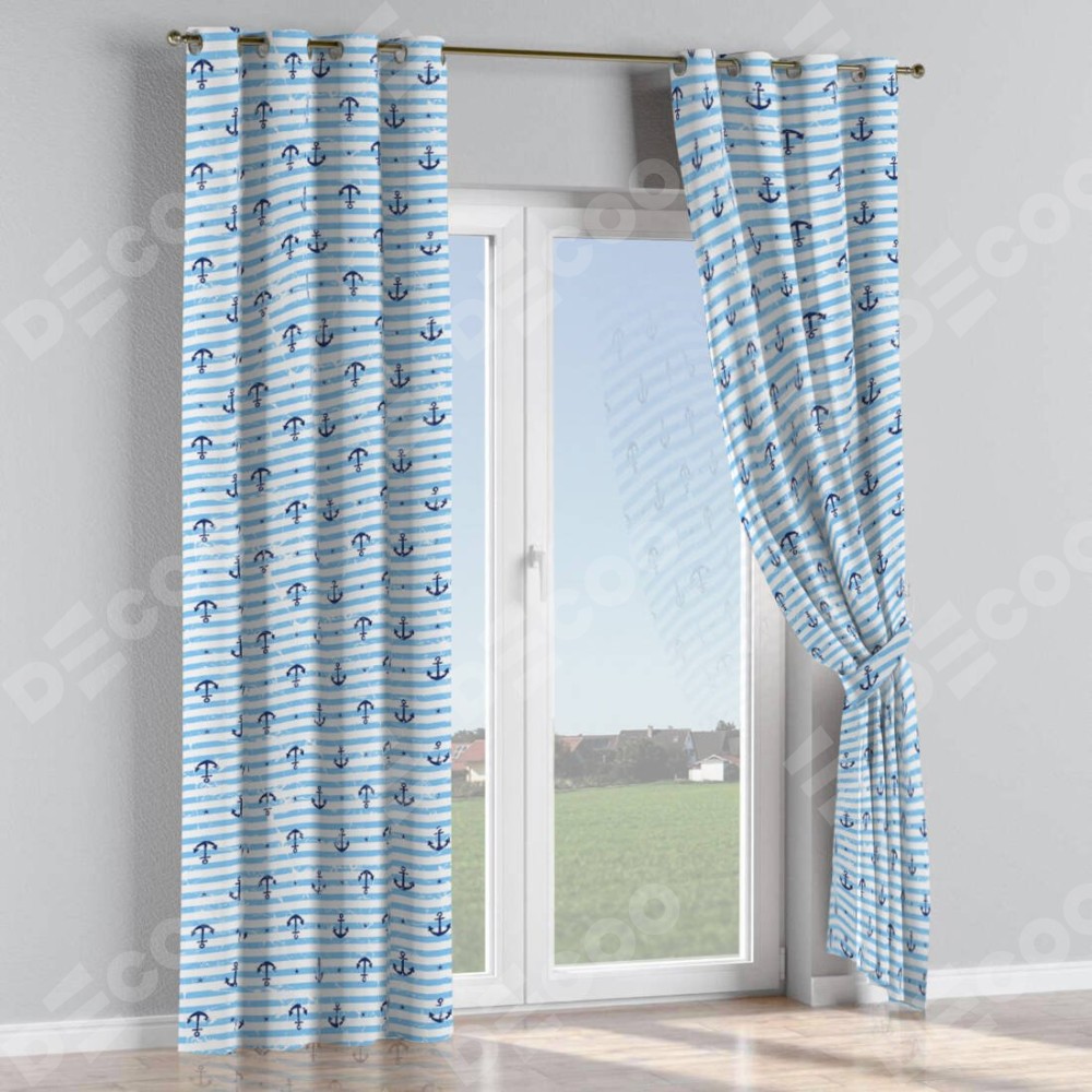 Комплект прямых штор, от производителя «Cortin», пошиты из ткани блэкаут с нанесением сублимационной печати «Полоски и якори». Данная модель пошита на люверсах, комплектуется на выбор круглым карнизом и подходит для монтажа на стену или потолок. Прямые шторы на люверсах шьются по стандарту с коэффициентом 1/2 (на 100 см. ширины проёма 200 см. ширины ткани), отличительным преимуществом данной модели является простой способ монтажа. Достаточно повесить ее на трубу и штора готова!