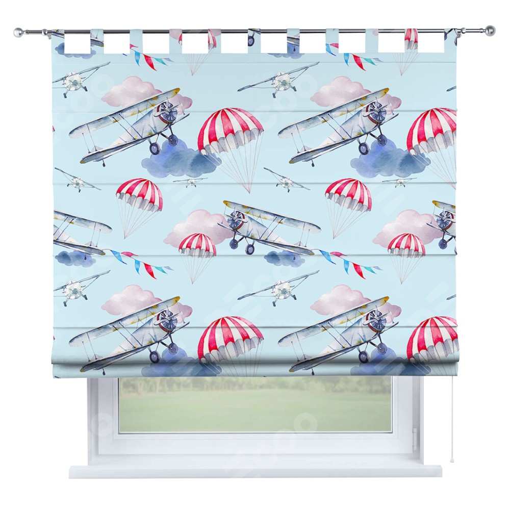Римская штора производителя «Cortin», используется для проёма, пошита из ткани блэкаут с нанесением сублимационной печати «Самолет». Данная модель пошита на петлях, комплектуется на выбор круглым карнизом и подходит для монтажа на стену. Римская штора на петлях имеет простую систему регулировки высоты, отличительным преимуществом данной модели является простой способ монтажа. Достаточно повесить ее на трубу и штора готова!