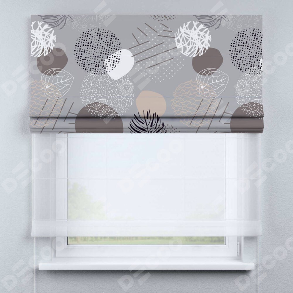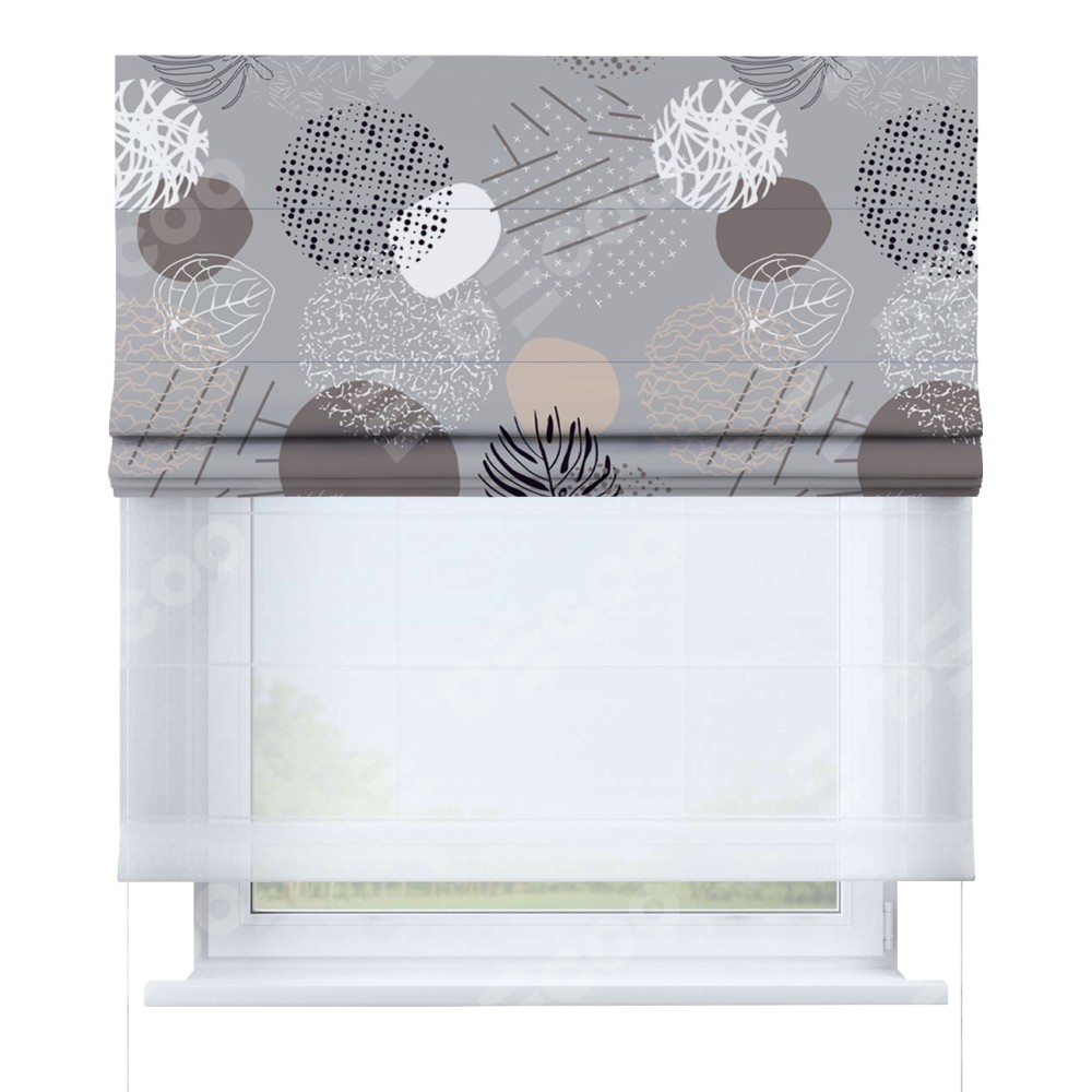 Римская штора день-ночь производителя «Cortin», используется для проёма, пошита из двух полотен, с лицевой блэкаут с нанесением сублимационной печати «Ботаника абстракция», вторая ткань тюль (по стандарту комплектуется тюль белого цвета артикул V-01). Имеет универсальный механизм и подходит для монтажа: на потолок, на стену и в нишу.