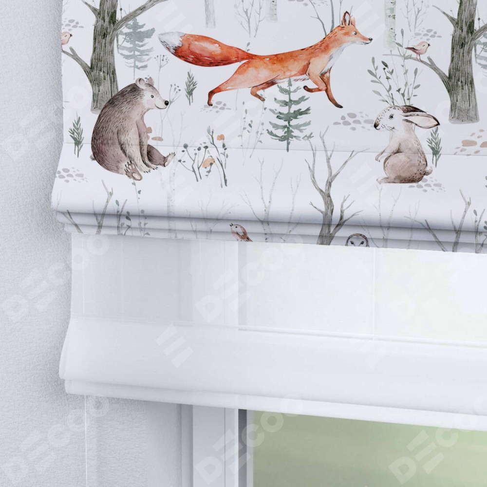 Римская штора день-ночь производителя «Cortin», используется для проёма, пошита из двух полотен, с лицевой блэкаут с нанесением сублимационной печати «Лесной питомник», вторая ткань тюль (по стандарту комплектуется тюль белого цвета артикул V-01). Имеет универсальный механизм и подходит для монтажа: на потолок, на стену и в нишу.