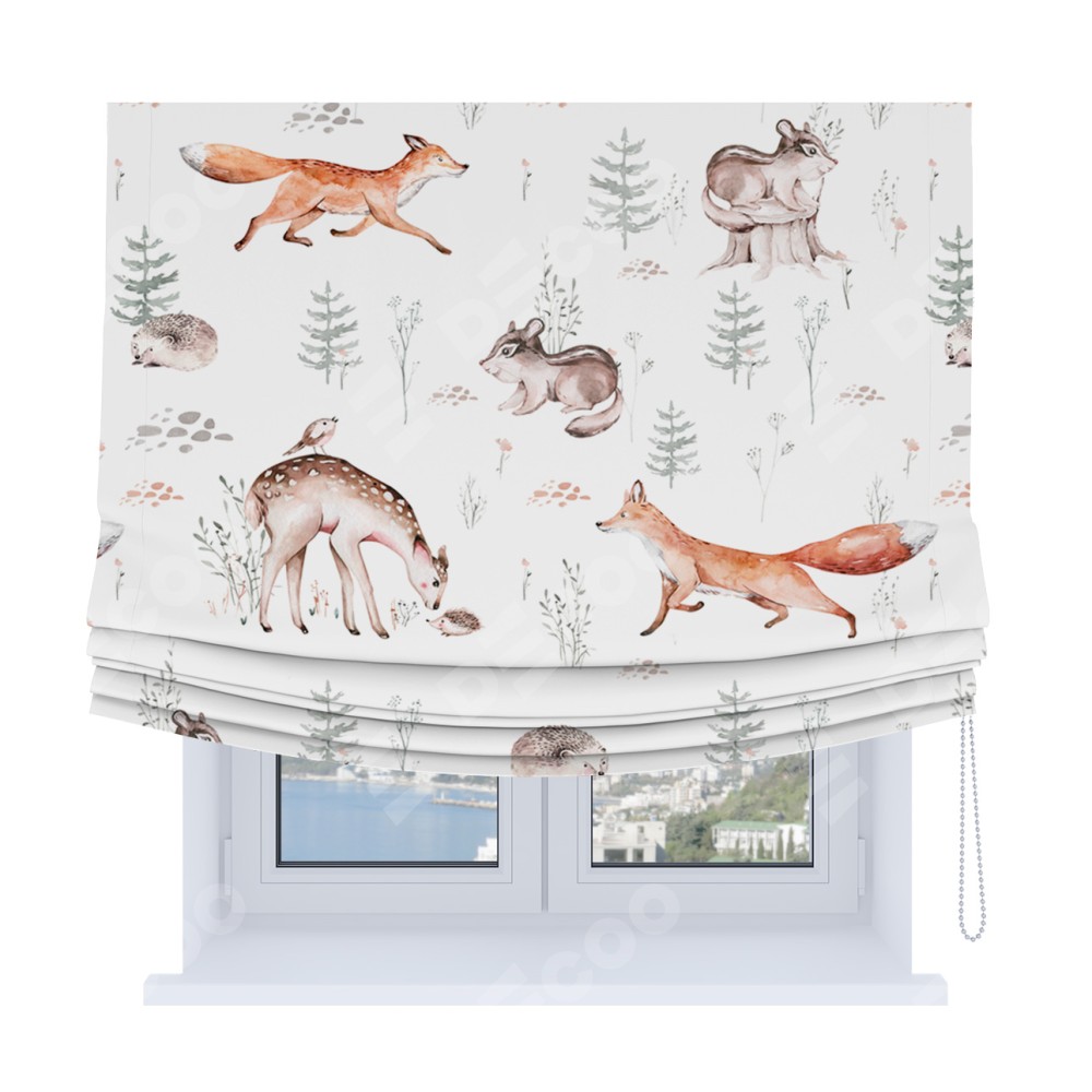 Римская штора Soft производителя «Cortin», используется для проёма, пошита из ткани блэкаут с нанесением сублимационной печати «Пушистый питомник». Имеет универсальный механизм и подходит для монтажа: на потолок, на стену и в нишу. В отличие от стандартных римских штор, римская штора Soft не имеет горизонтальных вставок и нижнего отвеса. Это позволяет ткани произвольно драпироваться в свободные мягкие складки.