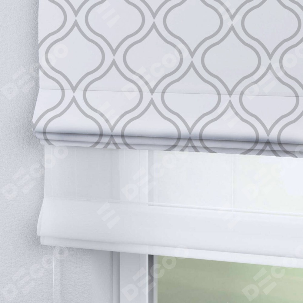 Римская штора день-ночь производителя «Cortin», используется для проёма, пошита из двух полотен, с лицевой блэкаут с нанесением сублимационной печати «Тайны востока белый», вторая ткань тюль (по стандарту комплектуется тюль белого цвета артикул V-01). Имеет универсальный механизм и подходит для монтажа: на потолок, на стену и в нишу.