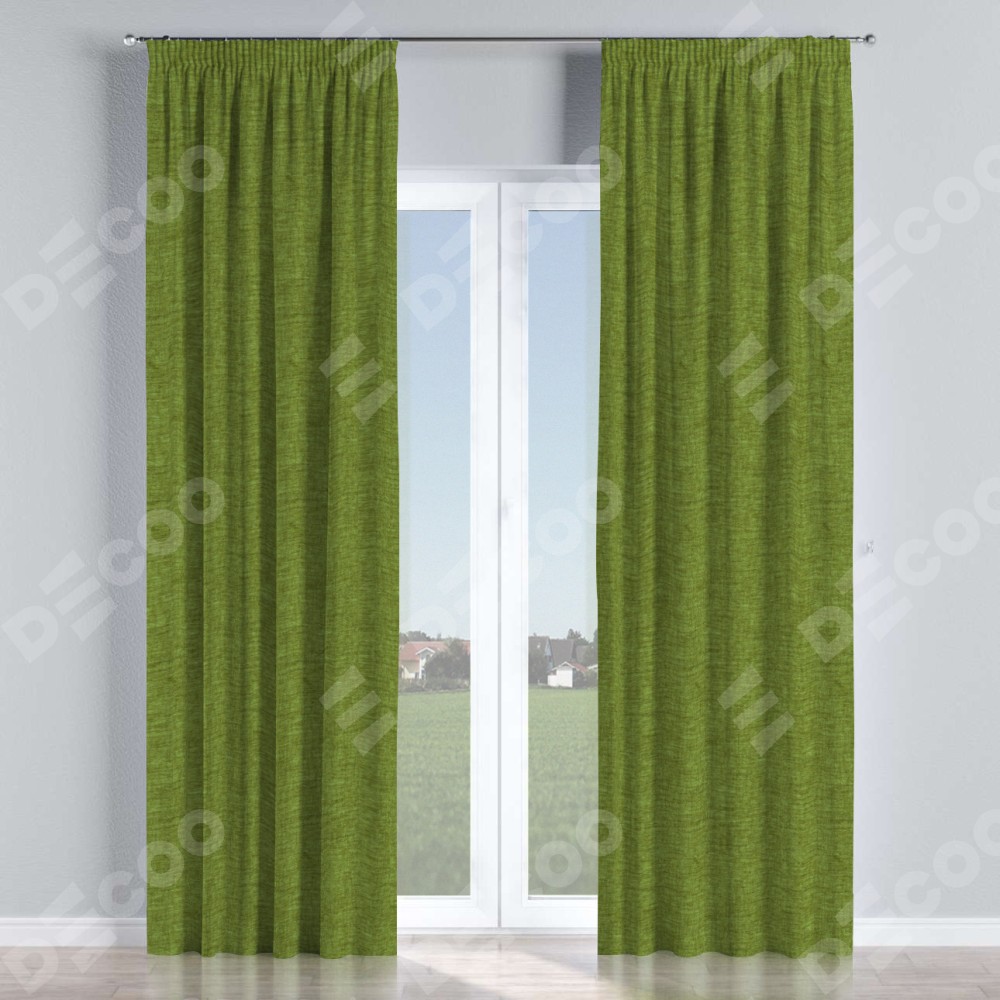 Комплект прямых штор, от производителя «Cortin», пошиты из ткани рогожка димаут салатовый, артикул ткани 80423. С изнаночной стороны в верхней части штор пристрачивается шторная лента с декоративными складками «Карандаш». Для создания элегантных складок прямые шторы шьются по стандарту с коэффициентом 1:2 (на 100 см. ширины проёма 200 см. ширины ткани).