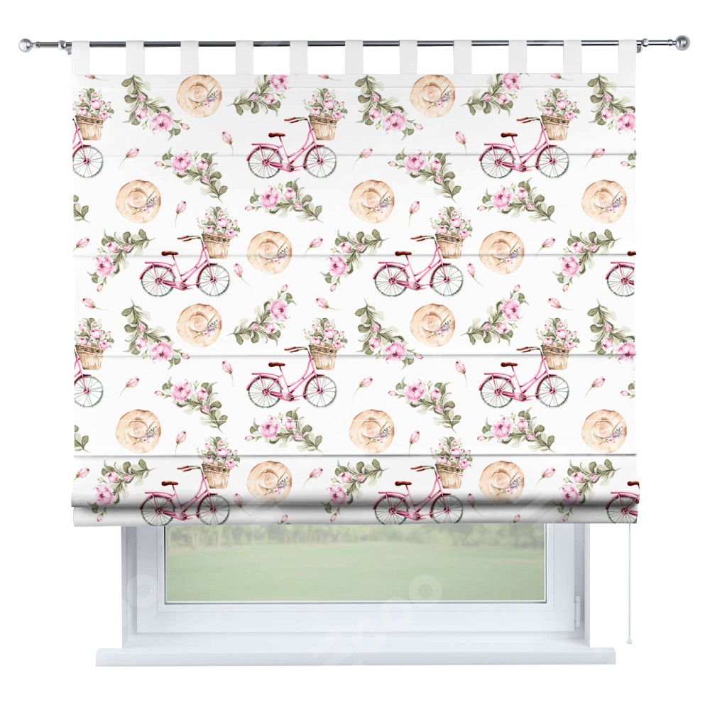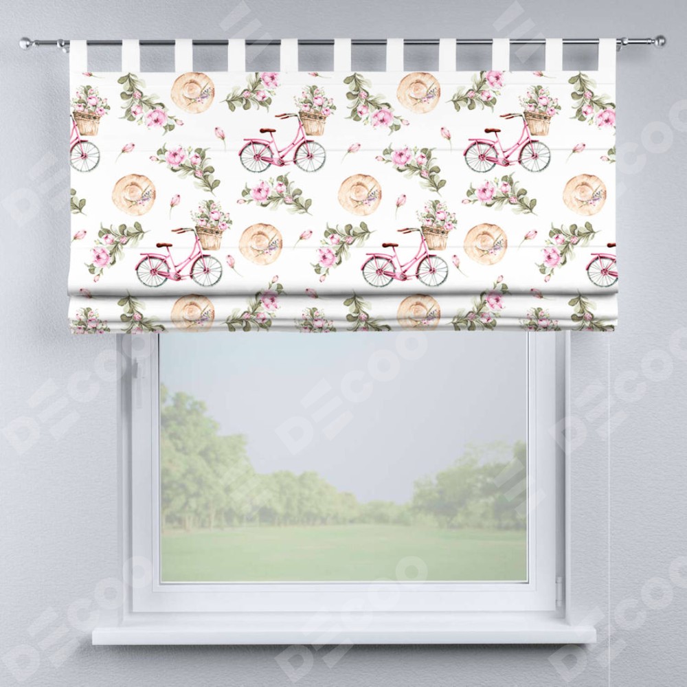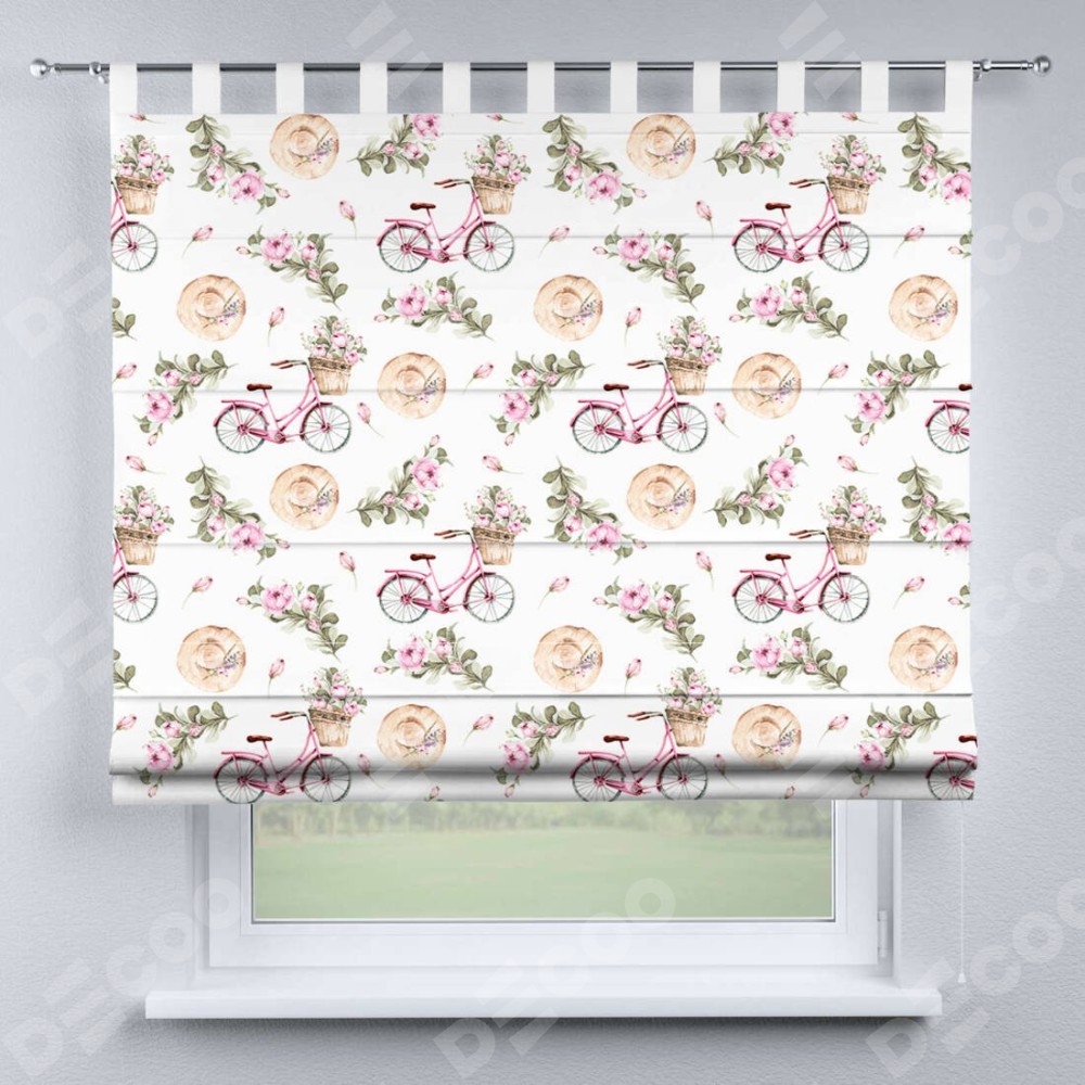 Римская штора производителя «Cortin», используется для проёма, пошита из ткани блэкаут с нанесением сублимационной печати «Розовый велосипед». Данная модель пошита на петлях, комплектуется на выбор круглым карнизом и подходит для монтажа на стену. Римская штора на петлях имеет простую систему регулировки высоты, отличительным преимуществом данной модели является простой способ монтажа. Достаточно повесить ее на трубу и штора готова!