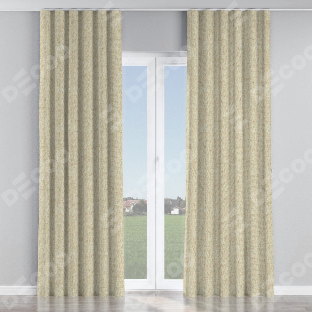 Комплект прямых штор, от производителя «Cortin», пошиты из ткани стиф димаут светло-бежевый, артикул ткани 18084. С изнаночной стороны в верхней части штор пристрачивается шторная лента с декоративными складками «Волна». Для создания элегантных складок прямые шторы шьются по стандарту с коэффициентом 1:2 (на 100 см. ширины проёма 200 см. ширины ткани).