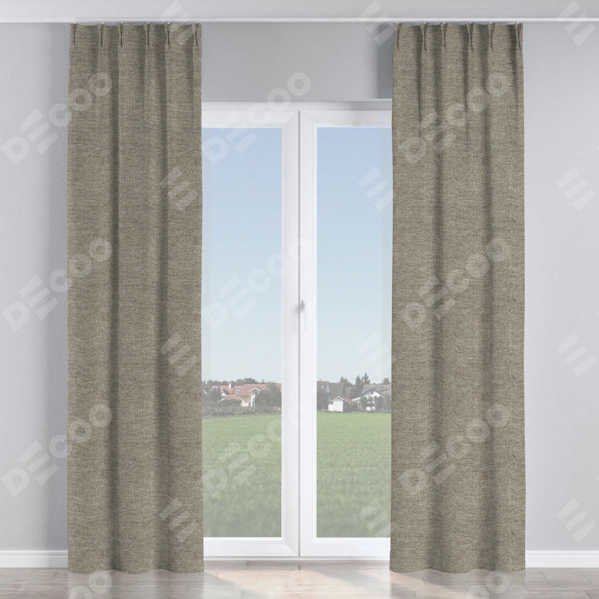 Комплект прямых штор, от производителя «Cortin», пошиты из ткани стиф димаут серо-коричневый, артикул ткани 44028. С изнаночной стороны в верхней части штор пристрачивается шторная лента с декоративными складками «Кустик». Для создания элегантных складок прямые шторы шьются по стандарту с коэффициентом 1:2 (на 100 см. ширины проёма 200 см. ширины ткани).