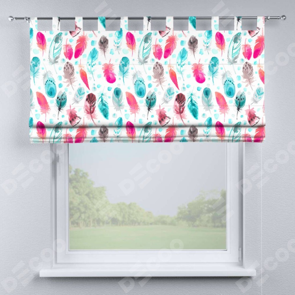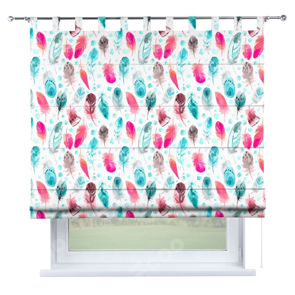 Римская штора производителя «Cortin», используется для проёма, пошита из ткани блэкаут с нанесением сублимационной печати «Перья». Данная модель пошита на петлях, комплектуется на выбор круглым карнизом и подходит для монтажа на стену. Римская штора на петлях имеет простую систему регулировки высоты, отличительным преимуществом данной модели является простой способ монтажа. Достаточно повесить ее на трубу и штора готова!