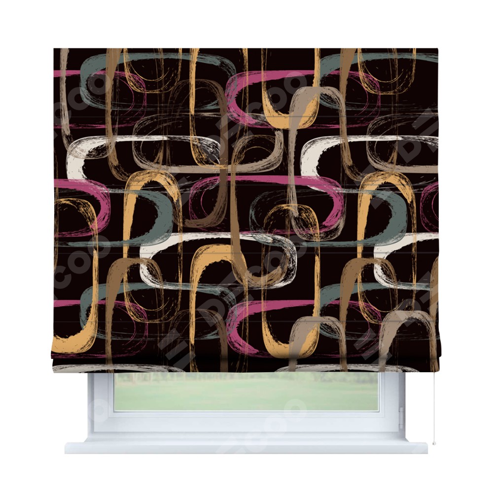 Римская штора производителя «Cortin», используется для проёма, пошита из ткани блэкаут с нанесением сублимационной печати «Тёмная палитра». Имеет универсальный механизм и подходит для монтажа: на потолок, на стену и в нишу.