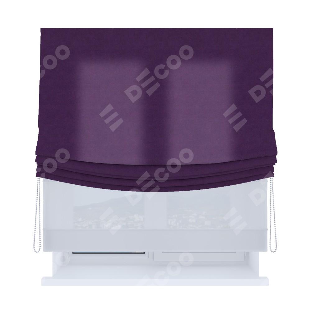 Римская штора день-ночь производителя «Cortin», используется для проёма, пошита из двух полотен, с лицевой стороны вельвет тёмно-фиолетовый артикул 17753, вторая ткань тюль (по стандарту комплектуется тюль белого цвета артикул V-01). Имеет универсальный механизм и подходит для монтажа: на потолок, на стену и в нишу. Удобное управление каждой шторой отдельно.