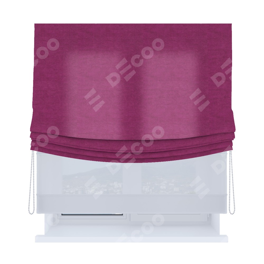 Римская штора день-ночь производителя «Cortin», используется для проёма, пошита из двух полотен, с лицевой стороны вельвет фиолетовый артикул 85552, вторая ткань тюль (по стандарту комплектуется тюль белого цвета артикул V-01). Имеет универсальный механизм и подходит для монтажа: на потолок, на стену и в нишу. Удобное управление каждой шторой отдельно.