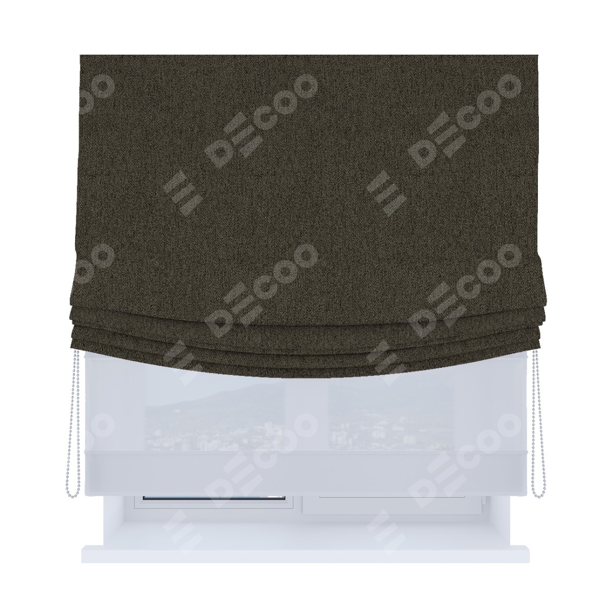 Римская штора день-ночь производителя «Cortin», используется для проёма, пошита из двух полотен, с лицевой стороны твид блэкаут тёмно-коричневый артикул 21584, вторая ткань тюль (по стандарту комплектуется тюль белого цвета артикул V-01). Имеет универсальный механизм и подходит для монтажа: на потолок, на стену и в нишу. Удобное управление каждой шторой отдельно.