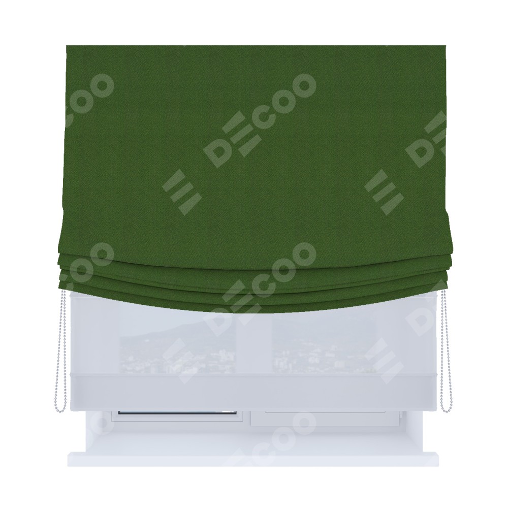Римская штора день-ночь производителя «Cortin», используется для проёма, пошита из двух полотен, с лицевой стороны блэкаут однотонный зелёный перламутр артикул 81859−2, вторая ткань тюль (по стандарту комплектуется тюль белого цвета артикул V-01). Имеет универсальный механизм и подходит для монтажа: на потолок, на стену и в нишу. Удобное управление каждой шторой отдельно.