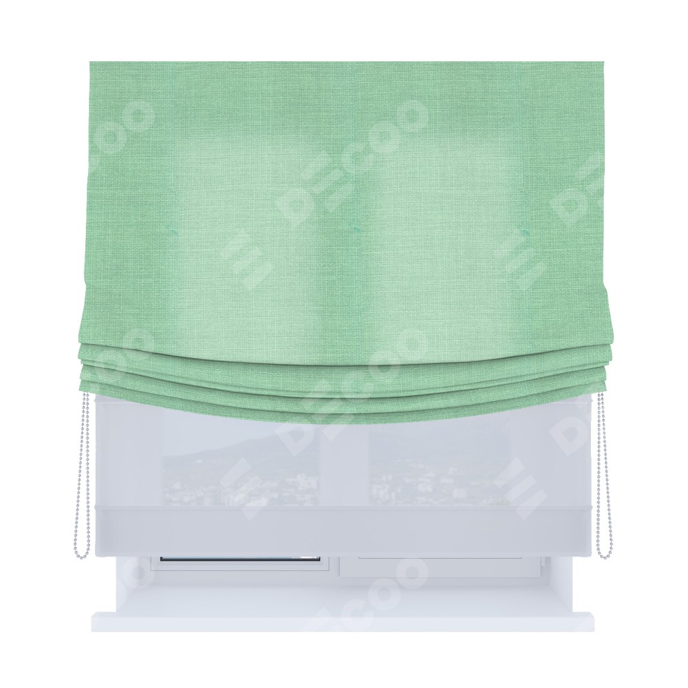 Римская штора день-ночь (двойная) от производителя «Cortin», используется для проёма. Пошита из двух полотен, основная ткань лён светло-бирюзовый артикул 74737, вторая ткань тюль (по стандарту используется тюль белого цвета артикул V-01). Имеет универсальный механизм и подходит для монтажа: на потолок, на стену и в нишу. Удобное управление каждой шторой отдельно.