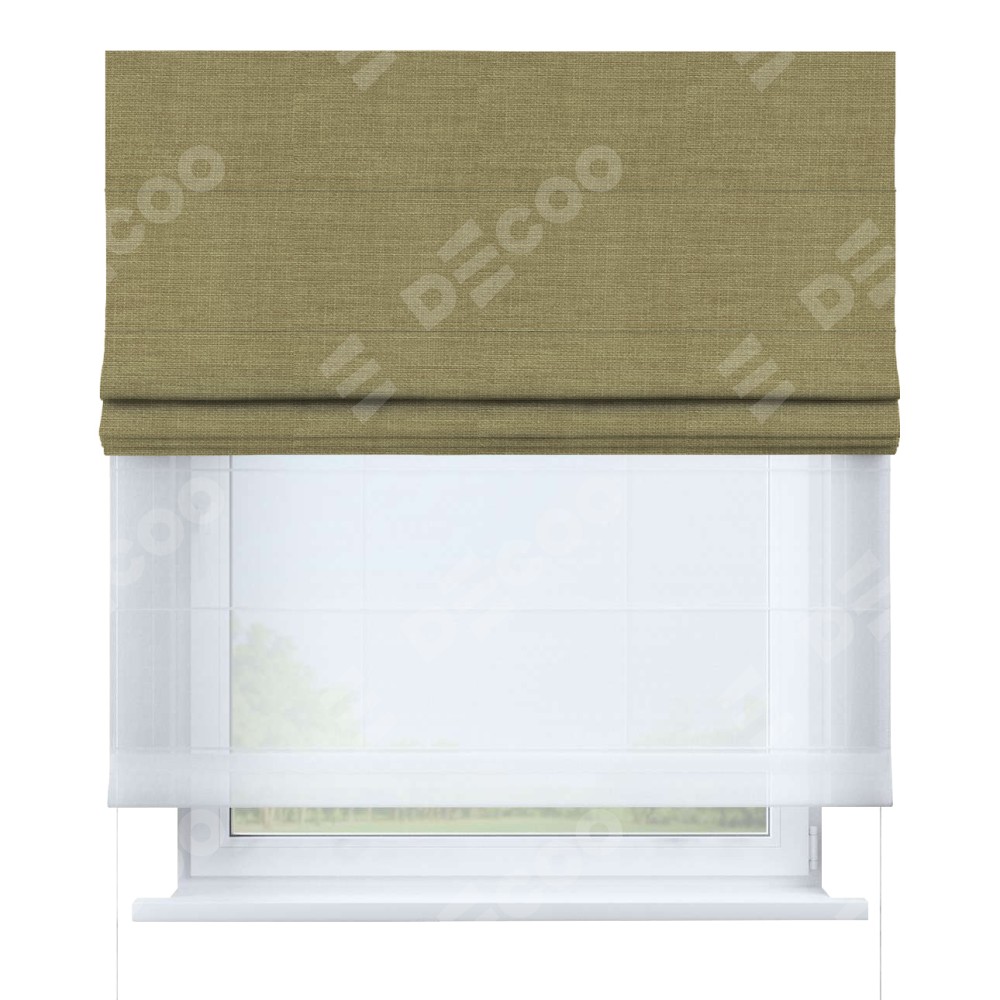 Римская штора день-ночь производителя «Cortin», используется для проёма, пошита из двух полотен, с лицевой стороны лён коричневый артикул 7443, вторая ткань тюль (по стандарту комплектуется тюль белого цвета артикул V-01). Имеет универсальный механизм и подходит для монтажа: на потолок, на стену и в нишу.