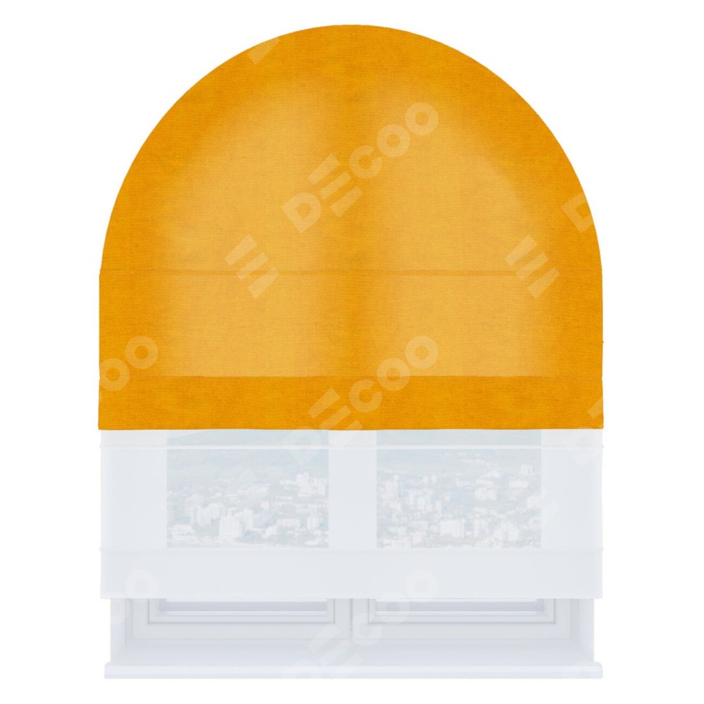 Римская штора день-ночь производителя «Cortin», используется для арочного проёма, пошита из двух полотен, с лицевой стороны вельвет желтый артикул 85547, вторая ткань тюль (по стандарту комплектуется тюль белого цвета артикул V-01). Штора шьётся по индивидуальным размерам, для данного типа римской шторы возможная ширина от 60 до 300 см. Удобное управление каждой шторой отдельно.