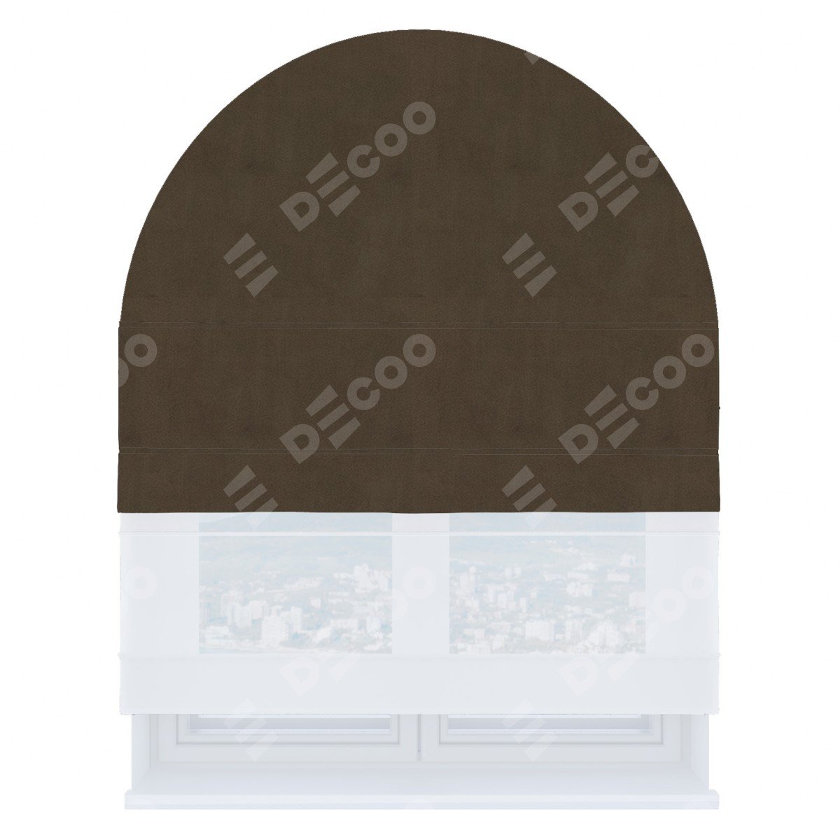 Римская штора день-ночь производителя «Cortin», используется для арочного проёма, пошита из двух полотен, с лицевой стороны бархат тёмно-коричневый артикул 5017, вторая ткань тюль (по стандарту комплектуется тюль белого цвета артикул V-01). Штора шьётся по индивидуальным размерам, для данного типа римской шторы возможная ширина от 60 до 300 см. Удобное управление каждой шторой отдельно.