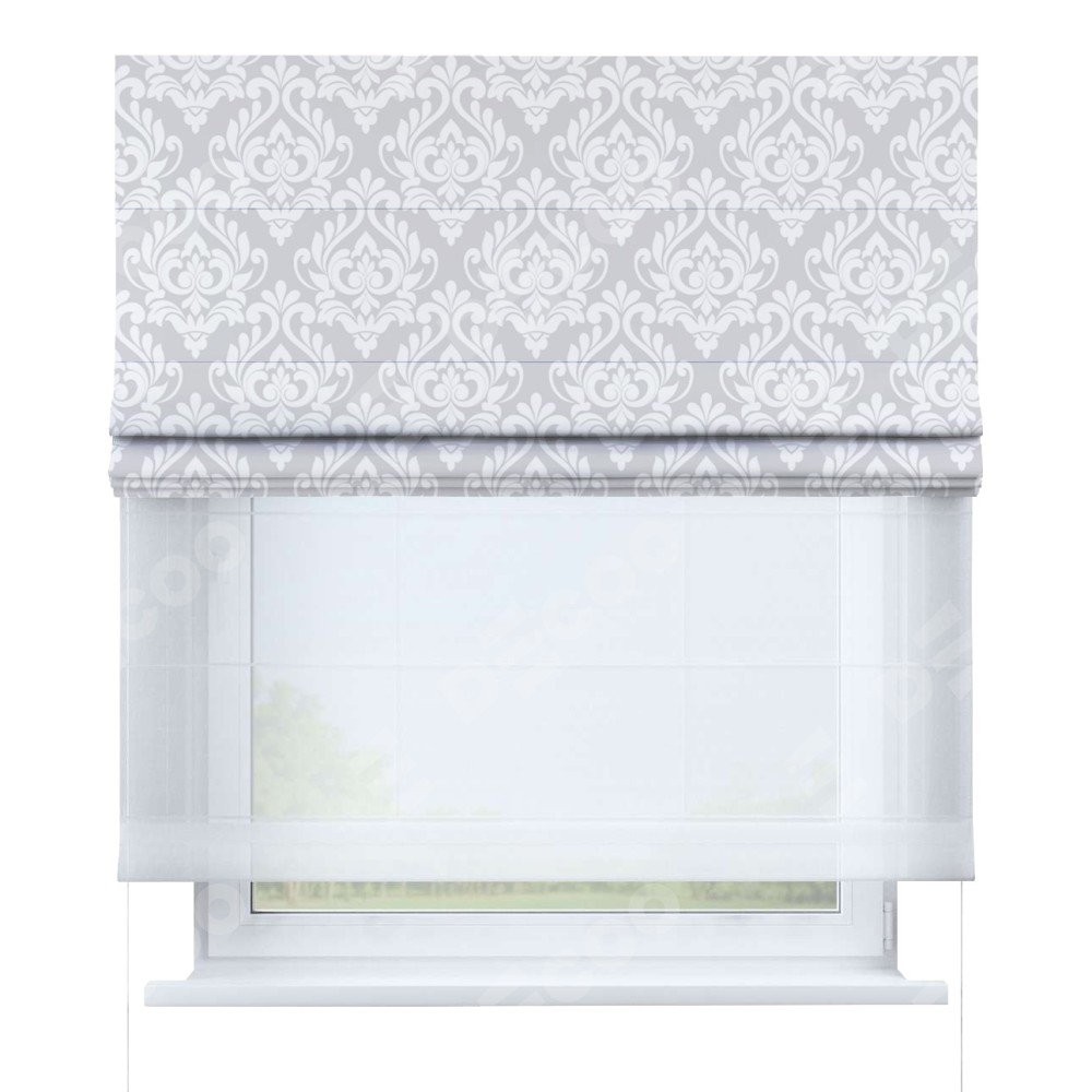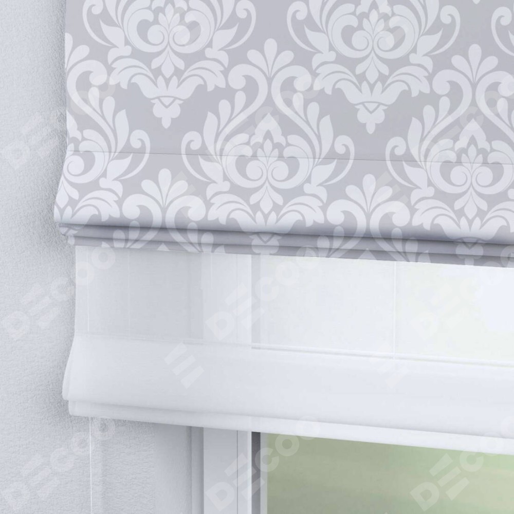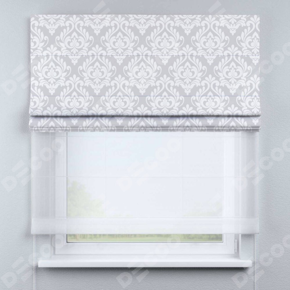 Римская штора день-ночь производителя «Cortin», используется для проёма, пошита из двух полотен, с лицевой блэкаут с нанесением сублимационной печати «Дамаск светлый», вторая ткань тюль (по стандарту комплектуется тюль белого цвета артикул V-01). Имеет универсальный механизм и подходит для монтажа: на потолок, на стену и в нишу.