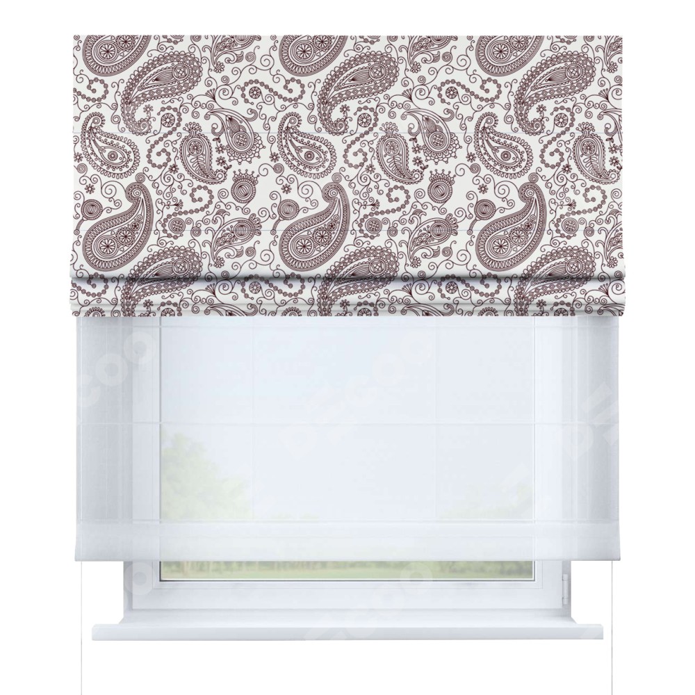 Римская штора день-ночь производителя «Cortin», используется для проёма, пошита из двух полотен, с лицевой блэкаут с нанесением сублимационной печати «Индийский узор», вторая ткань тюль (по стандарту комплектуется тюль белого цвета артикул V-01). Имеет универсальный механизм и подходит для монтажа: на потолок, на стену и в нишу.