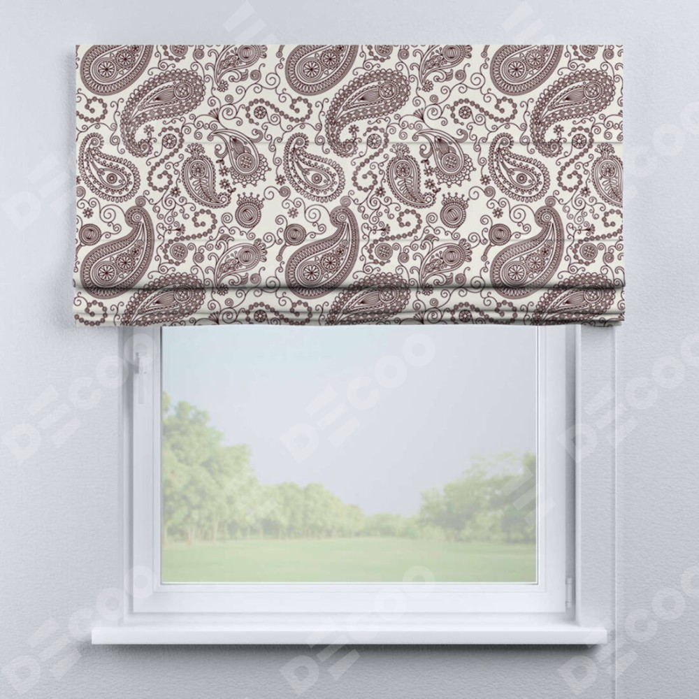 Римская штора производителя «Cortin», используется для проёма, пошита из ткани блэкаут с нанесением сублимационной печати «Индийский узор». Имеет универсальный механизм и подходит для монтажа: на потолок, на стену и в нишу.