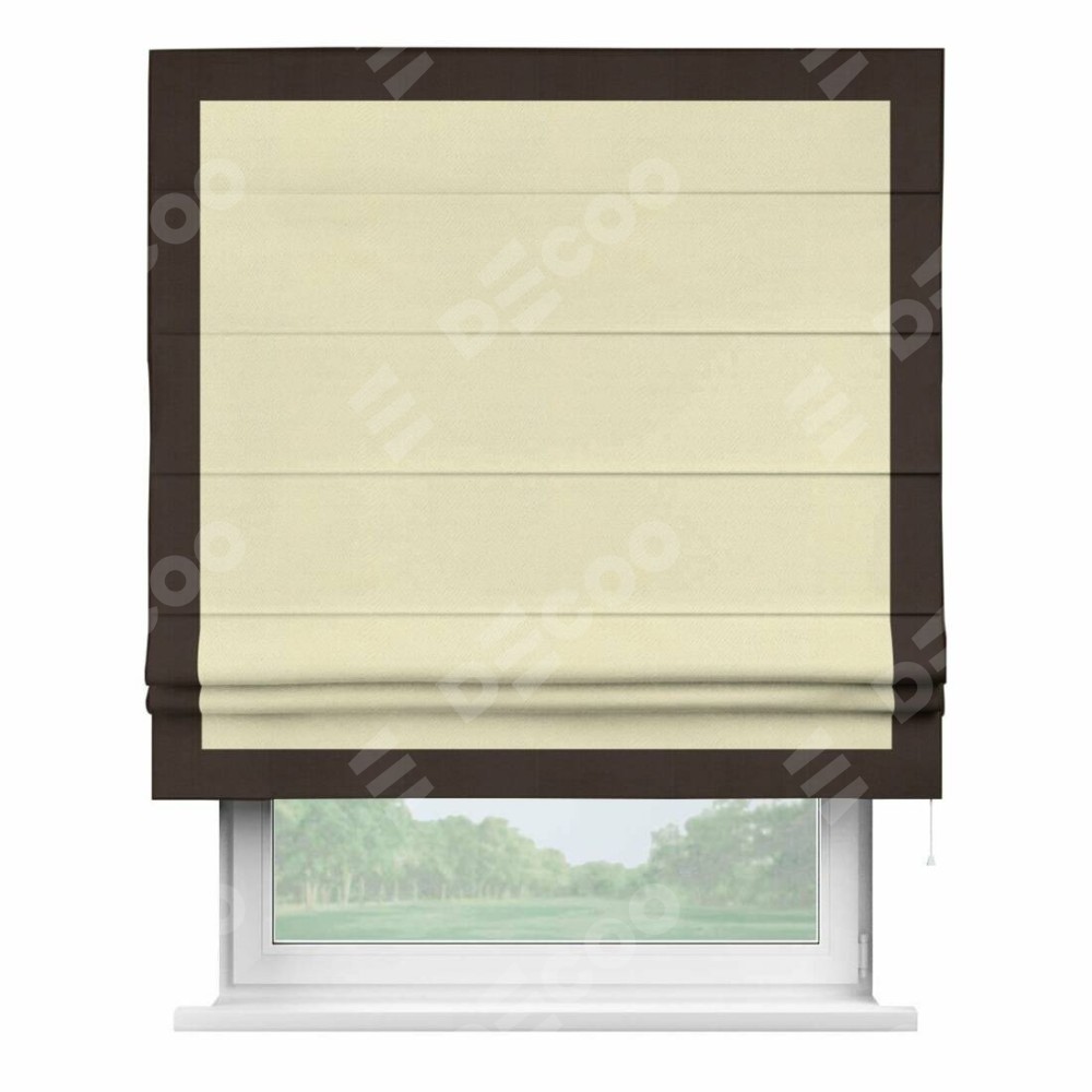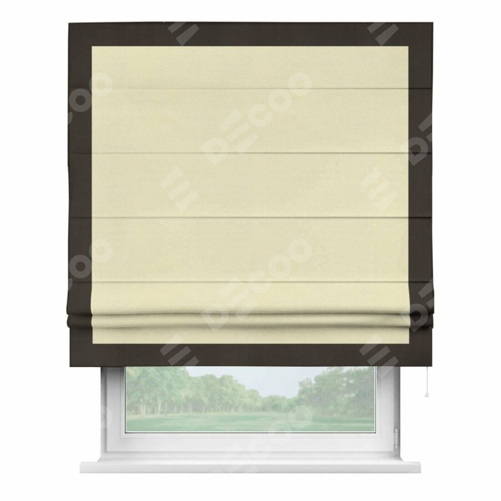 Римская штора производителя «Cortin», используется для проёма, пошита из ткани блэкаут однотонный бежевый, артикул ткани 88283. Отделка шторы кантом «Чесс», ткань для канта используется из блэкаута однотонного разной расцветки на выбор. Имеет универсальный механизм и подходит для монтажа: на потолок, на стену и в нишу.