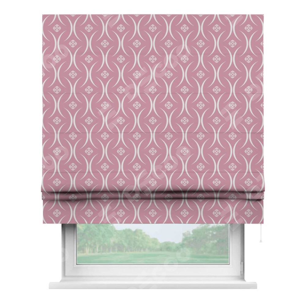 Римская штора производителя «Cortin», используется для проёма, пошита из ткани блэкаут с нанесением сублимационной печати «Воздушный узор розовый». Имеет универсальный механизм и подходит для монтажа: на потолок, на стену и в нишу.