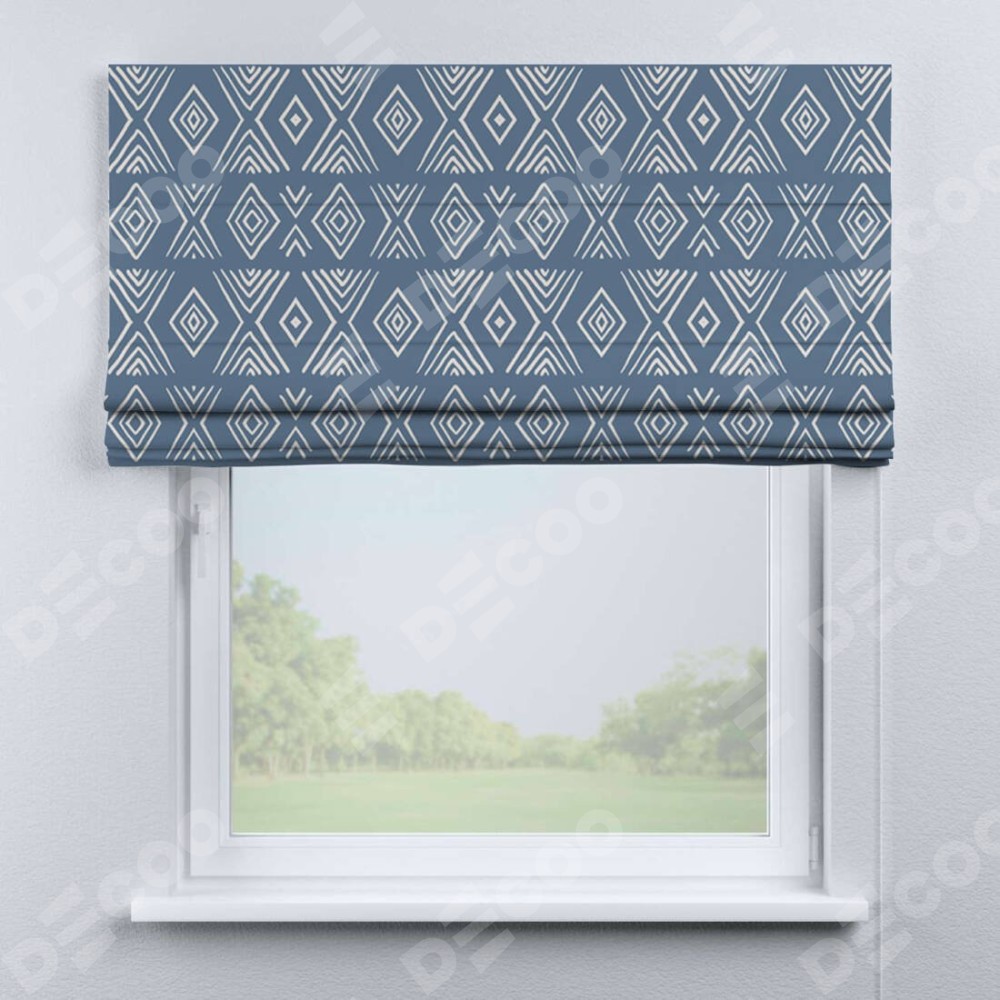 Римская штора производителя «Cortin», используется для проёма, пошита из ткани блэкаут с нанесением сублимационной печати «Графический орнамент». Имеет универсальный механизм и подходит для монтажа: на потолок, на стену и в нишу.