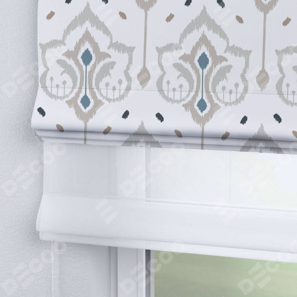 Римская штора день-ночь производителя «Cortin», используется для проёма, пошита из двух полотен, с лицевой блэкаут с нанесением сублимационной печати «Икат узор», вторая ткань тюль (по стандарту комплектуется тюль белого цвета артикул V-01). Имеет универсальный механизм и подходит для монтажа: на потолок, на стену и в нишу.