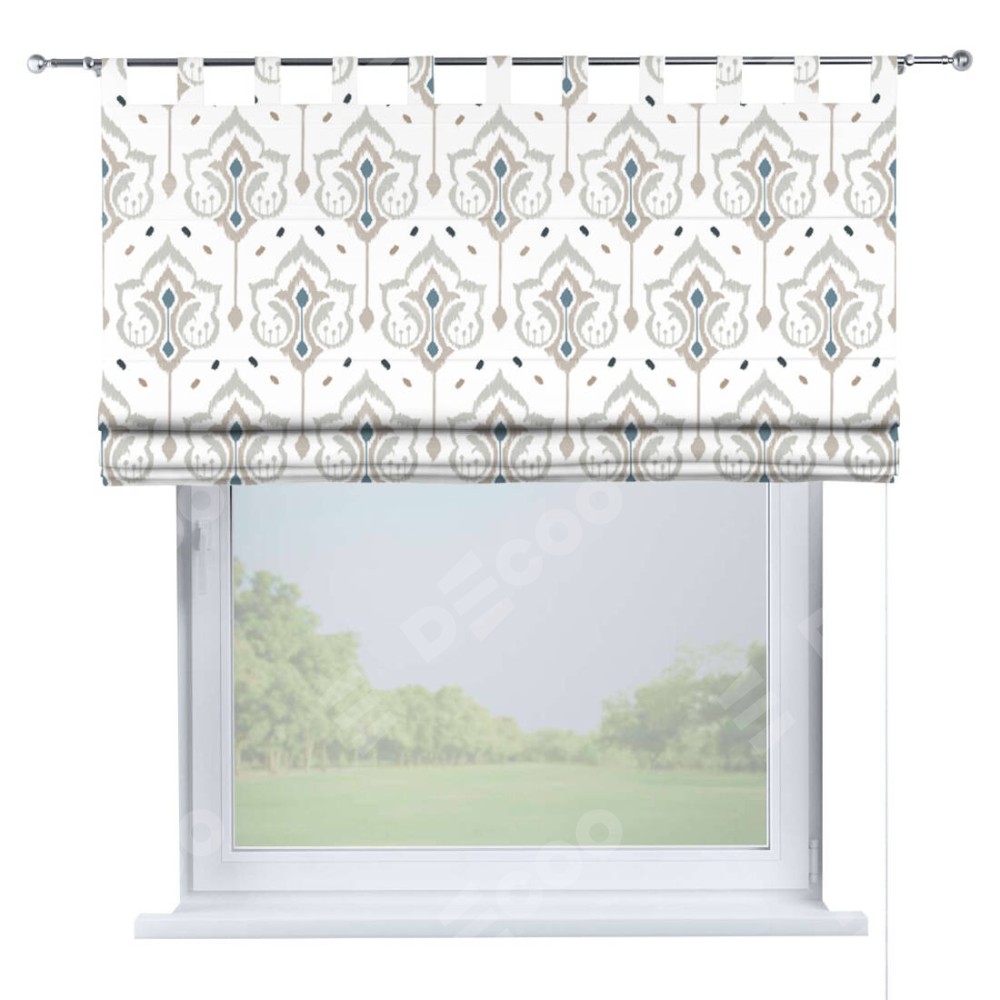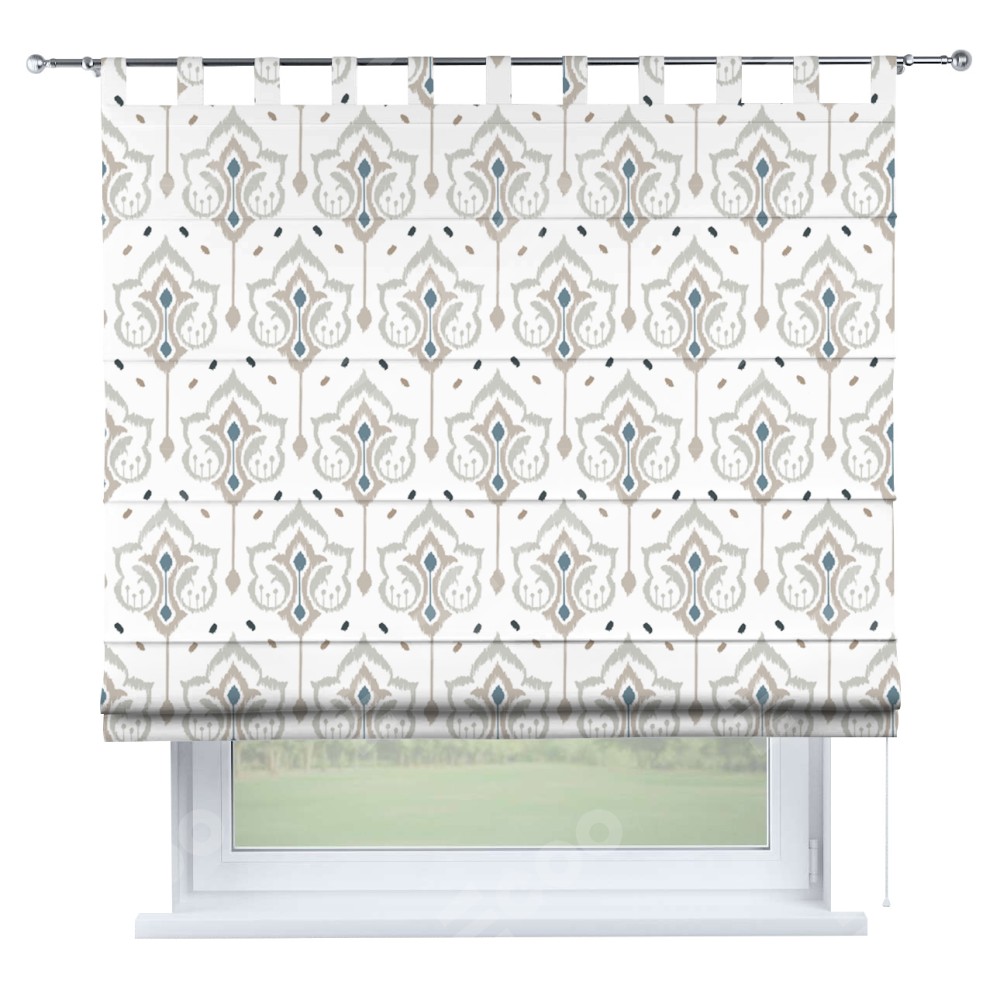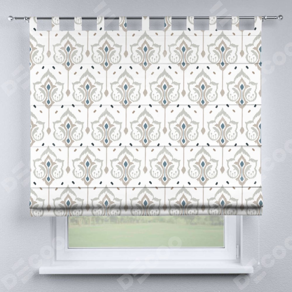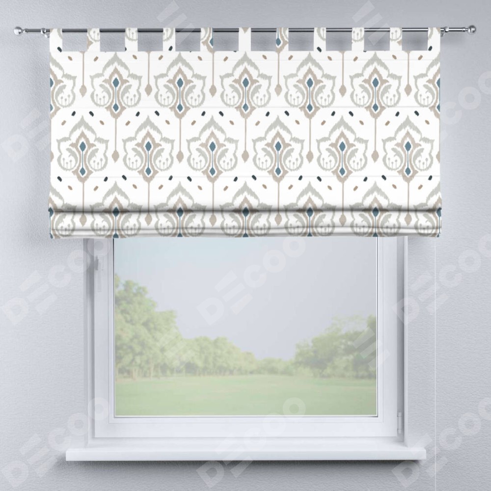 Римская штора производителя «Cortin», используется для проёма, пошита из ткани блэкаут с нанесением сублимационной печати «Икат узор». Данная модель пошита на петлях, комплектуется на выбор круглым карнизом и подходит для монтажа на стену. Римская штора на петлях имеет простую систему регулировки высоты, отличительным преимуществом данной модели является простой способ монтажа. Достаточно повесить ее на трубу и штора готова!