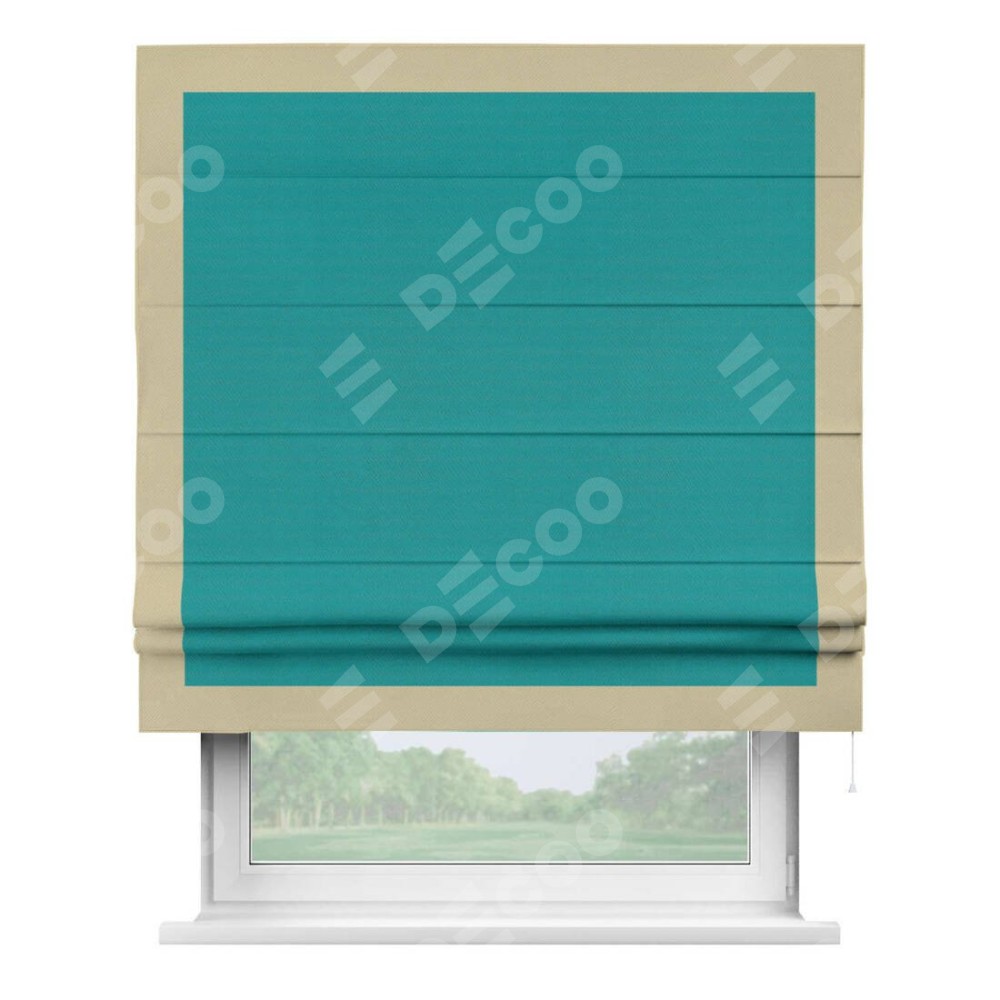 Римская штора производителя «Cortin», используется для проёма, пошита из ткани блэкаут однотонный бирюзовый, артикул ткани 88297. Отделка шторы кантом «Чесс», ткань для канта используется из блэкаута однотонного разной расцветки на выбор. Имеет универсальный механизм и подходит для монтажа: на потолок, на стену и в нишу.