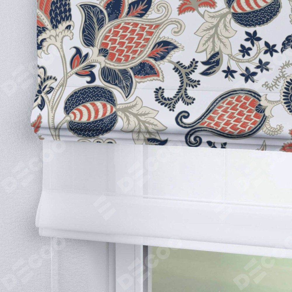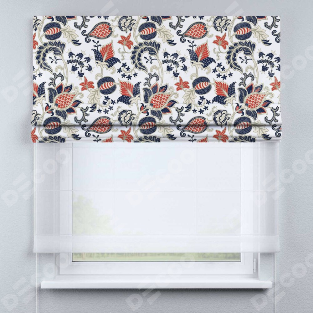 Римская штора день-ночь производителя «Cortin», используется для проёма, пошита из двух полотен, с лицевой блэкаут с нанесением сублимационной печати «Пёстрые цветы», вторая ткань тюль (по стандарту комплектуется тюль белого цвета артикул V-01). Имеет универсальный механизм и подходит для монтажа: на потолок, на стену и в нишу.