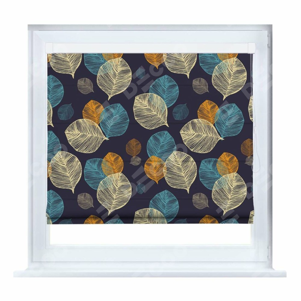 Римская штора производителя «Cortin», устанавливается на створку окна, пошита из ткани блэкаут с нанесением сублимационной печати «Листья в ночи». Штора шьётся по индивидуальным размерам, для данного типа римской шторы возможная ширина от 35 до 150 см., высота до 250 см.