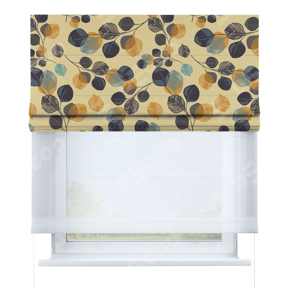 Римская штора день-ночь производителя «Cortin», используется для проёма, пошита из двух полотен, с лицевой блэкаут с нанесением сублимационной печати «Листья в янтаре», вторая ткань тюль (по стандарту комплектуется тюль белого цвета артикул V-01). Имеет универсальный механизм и подходит для монтажа: на потолок, на стену и в нишу.