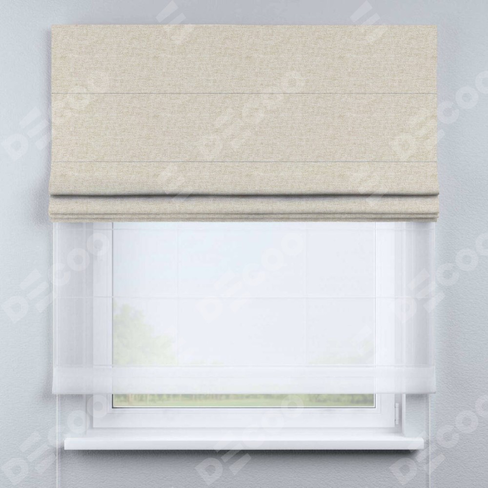 Римская штора день-ночь производителя «Cortin», используется для проёма, пошита из двух полотен, с лицевой стороны стиф димаут молочный артикул 18082, вторая ткань тюль (по стандарту комплектуется тюль белого цвета артикул V-01). Имеет универсальный механизм и подходит для монтажа: на потолок, на стену и в нишу.