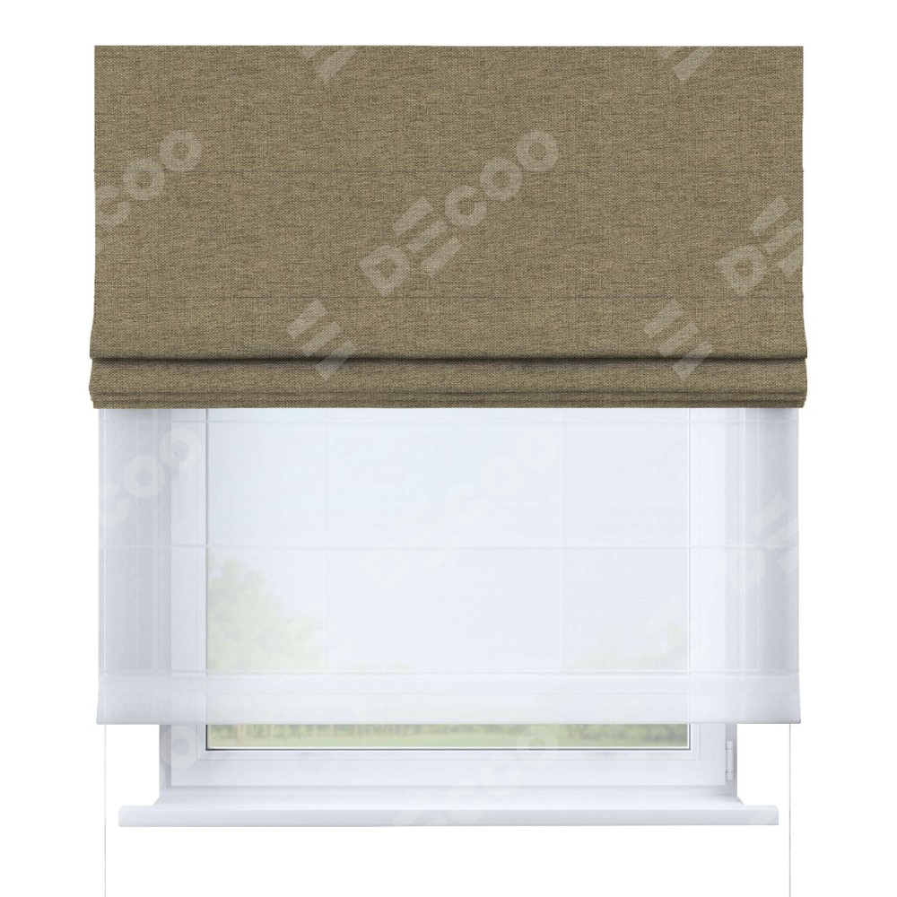 Римская штора день-ночь производителя «Cortin», используется для проёма, пошита из двух полотен, с лицевой стороны стиф димаут тёмно-бежевый артикул 18085, вторая ткань тюль (по стандарту комплектуется тюль белого цвета артикул V-01). Имеет универсальный механизм и подходит для монтажа: на потолок, на стену и в нишу.