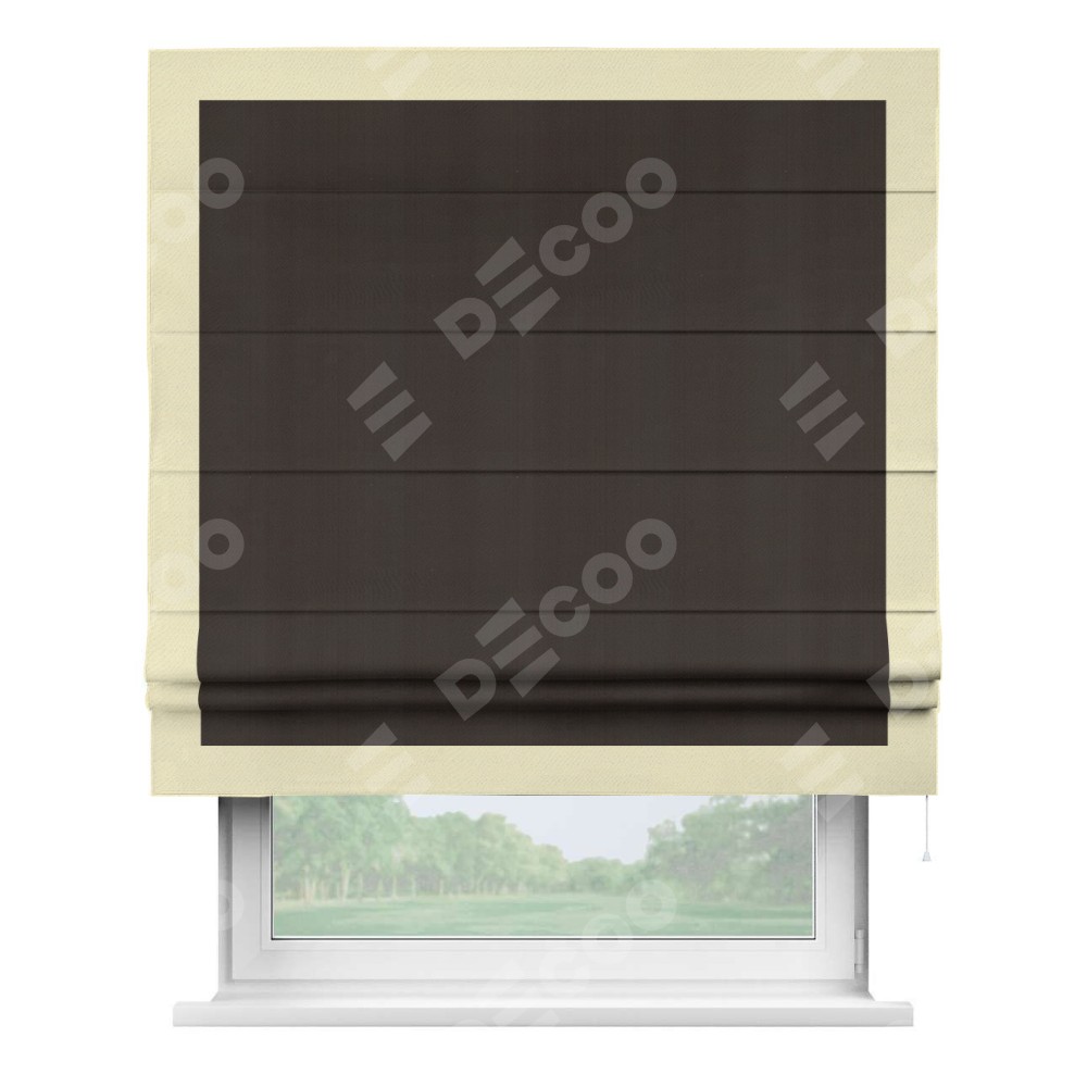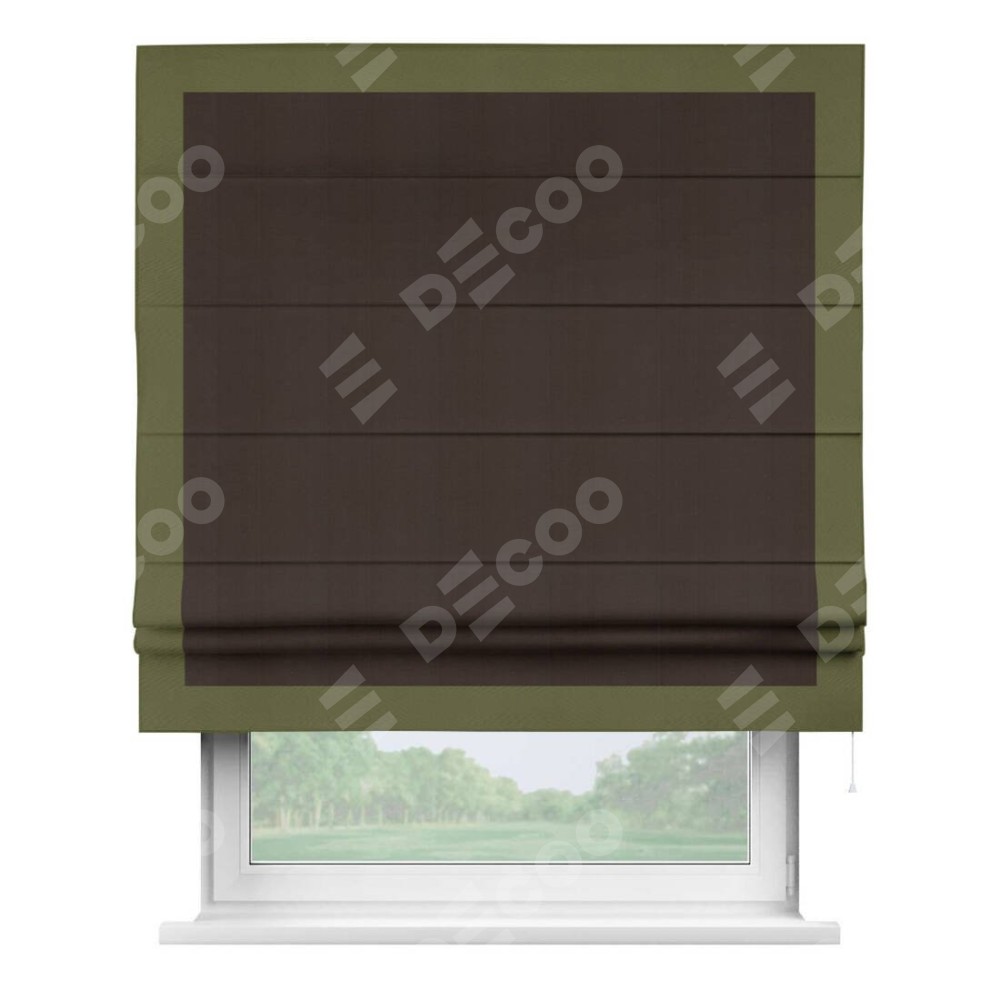 Римская штора производителя «Cortin», используется для проёма, пошита из ткани блэкаут однотонный венге, артикул ткани 88286. Отделка шторы кантом «Чесс», ткань для канта используется из блэкаута однотонного разной расцветки на выбор. Имеет универсальный механизм и подходит для монтажа: на потолок, на стену и в нишу.