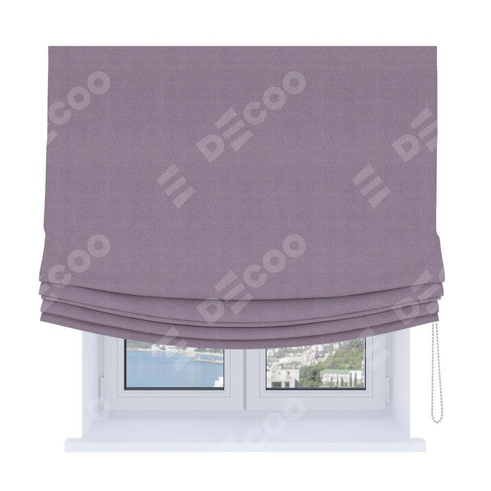 Римская штора Soft производителя «Cortin», используется для проёма, пошита из ткани блэкаут однотонный светло-сиреневый, артикул ткани 29333−1. Имеет универсальный механизм и подходит для монтажа: на потолок, на стену и в нишу. В отличие от стандартных римских штор, римская штора Soft не имеет горизонтальных вставок и нижнего отвеса. Это позволяет ткани произвольно драпироваться в свободные мягкие складки.