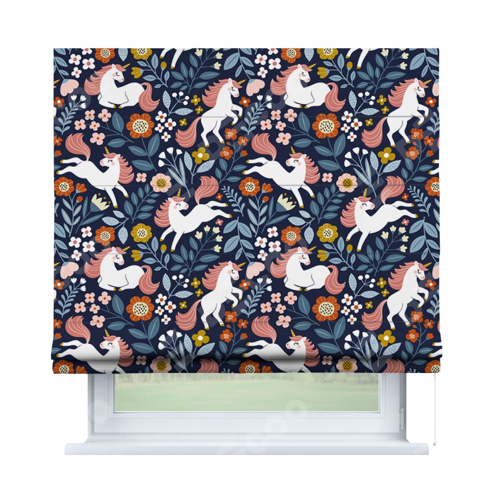 Римская штора производителя «Cortin», используется для проёма, пошита из ткани блэкаут с нанесением сублимационной печати «Цветы и единороги». Имеет универсальный механизм и подходит для монтажа: на потолок, на стену и в нишу.
