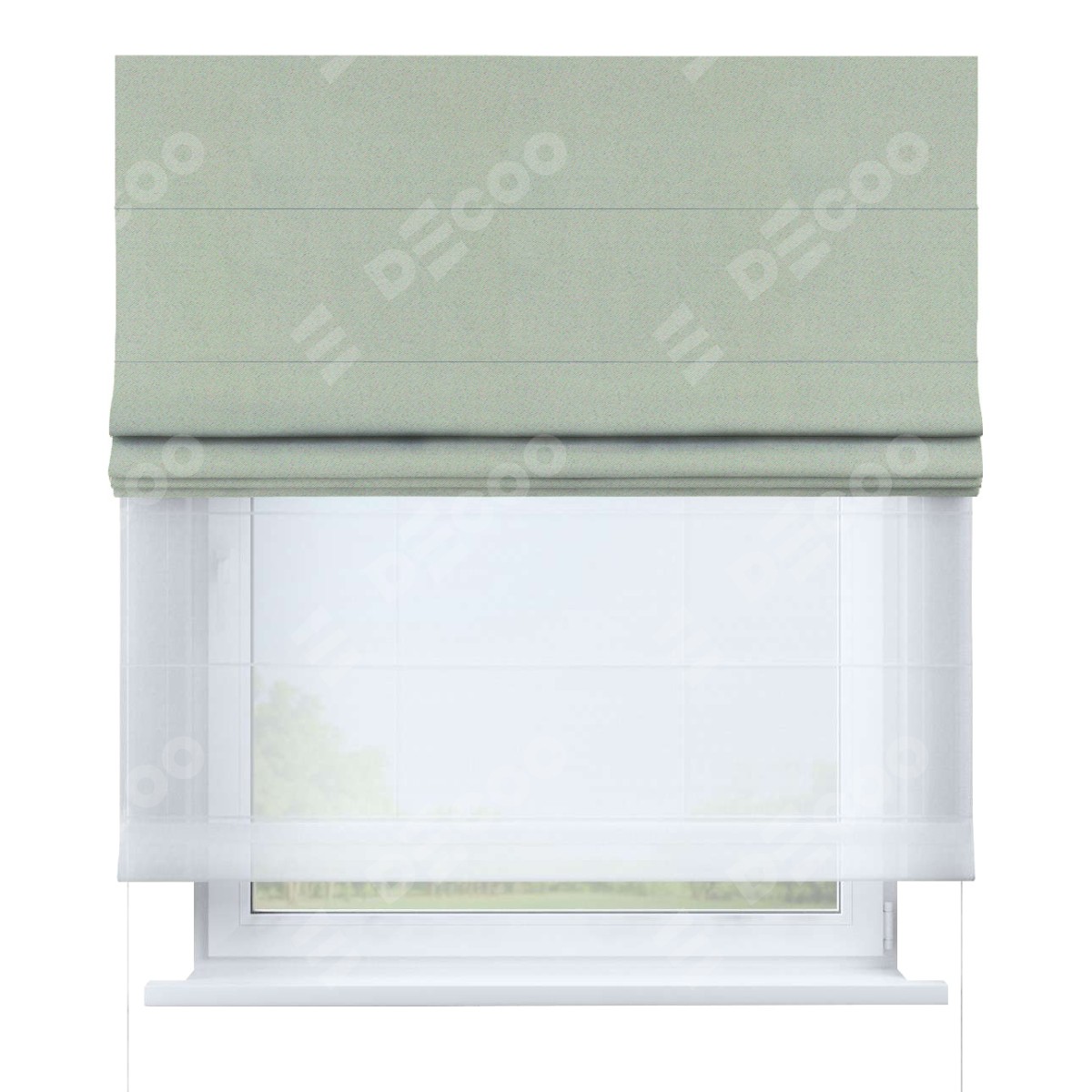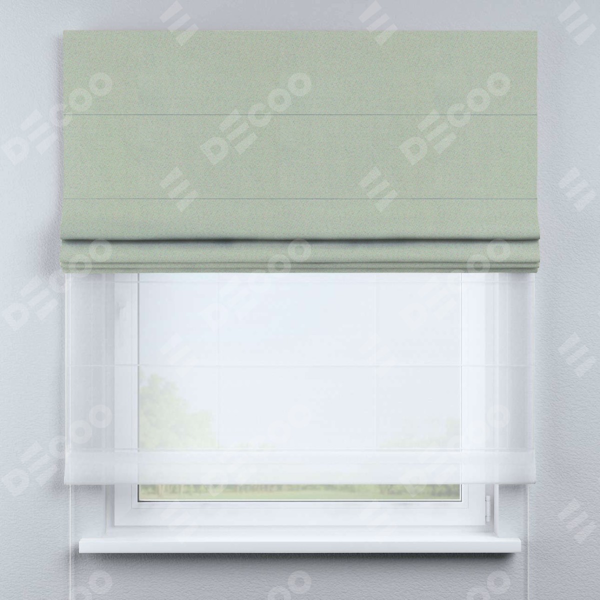 Римская штора день-ночь производителя «Cortin», используется для проёма, пошита из двух полотен, с лицевой стороны блэкаут однотонный светло-серый артикул 29332−2, вторая ткань тюль (по стандарту комплектуется тюль белого цвета артикул V-01). Имеет универсальный механизм и подходит для монтажа: на потолок, на стену и в нишу.