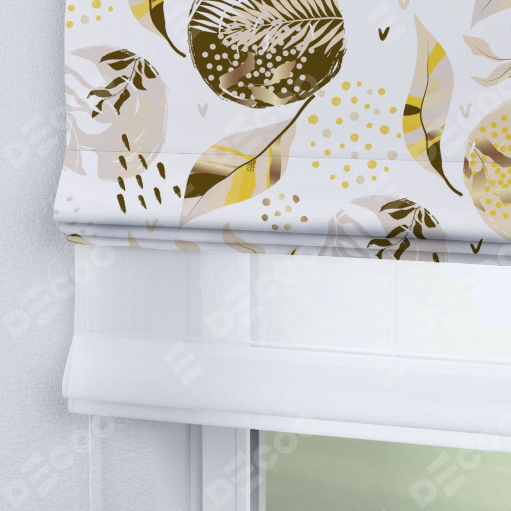 Римская штора день-ночь производителя «Cortin», используется для проёма, пошита из двух полотен, с лицевой блэкаут с нанесением сублимационной печати «Золотые листья», вторая ткань тюль (по стандарту комплектуется тюль белого цвета артикул V-01). Имеет универсальный механизм и подходит для монтажа: на потолок, на стену и в нишу.