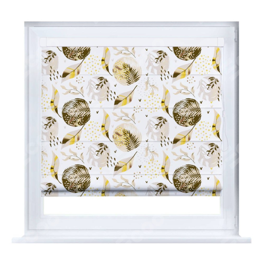 Римская штора производителя «Cortin», устанавливается на створку окна, пошита из ткани блэкаут с нанесением сублимационной печати «Золотые листья». Штора шьётся по индивидуальным размерам, для данного типа римской шторы возможная ширина от 35 до 150 см., высота до 250 см.